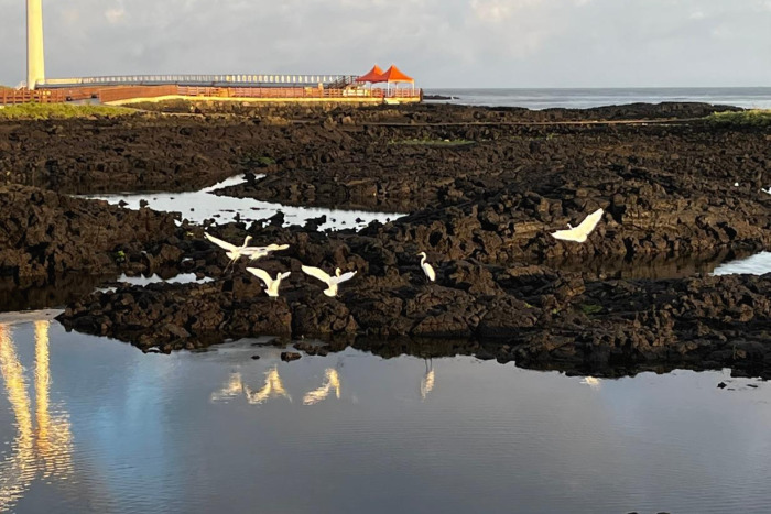한경면에서의 첫날 아침은 운동 겸 새벽 산책으로 시작한다. 새벽 5시 반쯤 집을 나서는데, 제비와 참새는 이미 시장이라도 열린 양 시끄럽게 지저귄다. 신창 풍차 해안을 따라 걷는 새벽 산책은 한적해서 좋았다. 도로가로 올라와 있던 게들이 재바르게 피해 숨느라 정신없다. 멀리까지 시원하게 열린 바다와 산들산들 불어오는 바람은 상쾌하다. 짙고 푸른 제주 바다는 간간이 구름 품은 맑고 푸른 하늘과 선명한 경계를 그린다. 그 사이로 나란히 늘어선 거대한 풍차는 천천히 날개를 돌린다. 가다 보니 하얀 백로들이 모여 아침 식사를 준비하고 있다. 첫날 아침부터 작은 소동이 있었지만, 이런 길이라면 매일 산책 나설 맛이 난다고 생각했다.