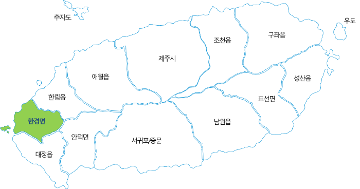이번엔 제주도의 서쪽에 위치한 '한경면'라는 작은 동네에서 지내게 되었다. 위로는 한림읍, 아래로는 서귀포시 대정읍, 동쪽으로 안덕면과 맞닿아 있는데, 전체 인구가 1만 명이 안 되는 한적하고 조용한 곳이다. 육지에서 제주를 들어오는 관문인 제주시나 성산 같이 많이 알려진 광관지도 아니고 한라산과 접해있지도 않는 지역으로, 주민들은 주로 농업과 어업에 종사한다고 한다.
