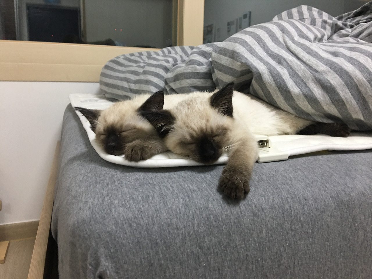 하루 종일 고양이들을 보며 몇 번의 롤러코스터를 탔을까. 혹시 아직 가까워지지 못했나 싶어 널브러져 자고 있는 두 마리를 굳이 붙여서 뉘어놓고 별 저항 없이 함께 누운 고양이들을 보고 흐뭇하다가도, 잠시 후에 또 조금 떨어져 모습을 보면서 시무룩해졌다. 하루가 참 길었다. 회사에서 ㅈ이 돌아오길, 북적이는 퇴근시간이 빨리 오길 기다렸다.