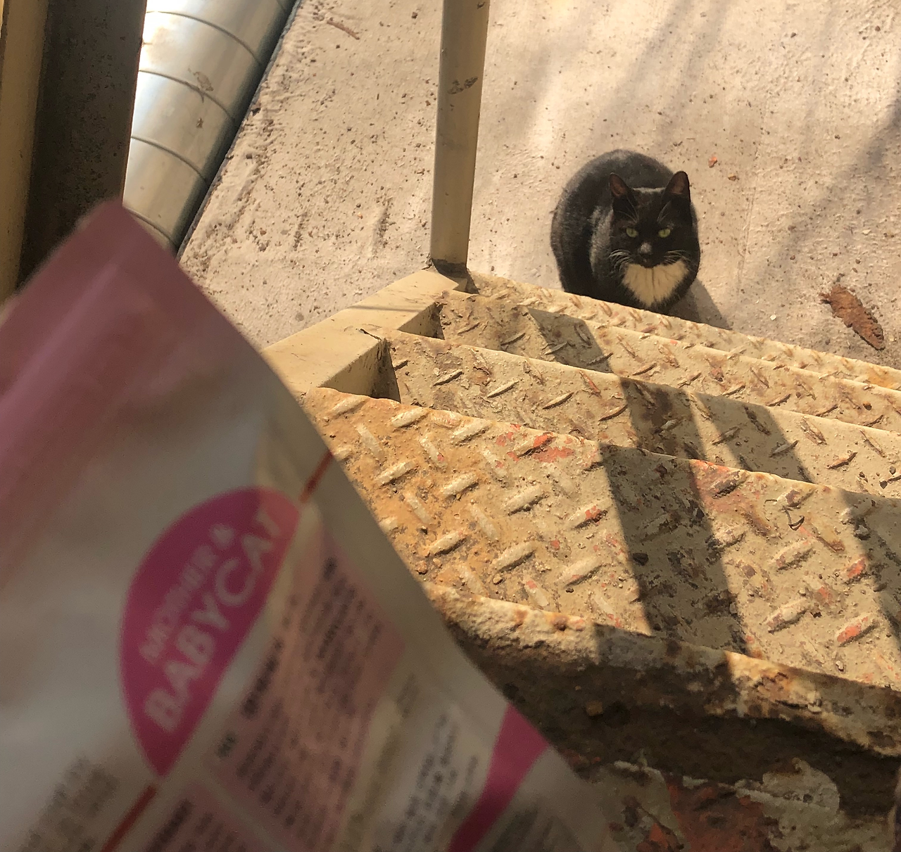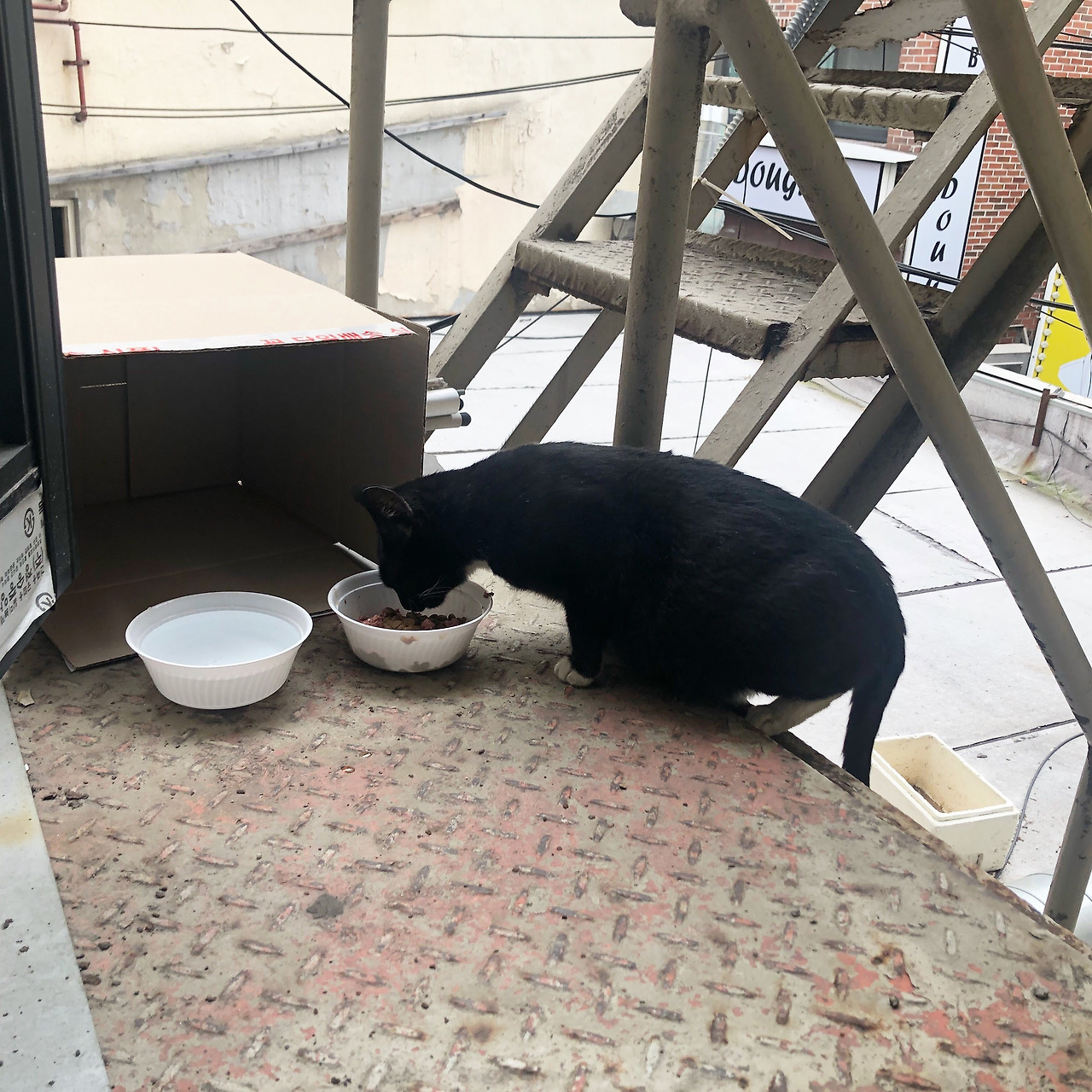 다음날 비슷한 시간 다시 비상계단 문을 열었을 때, 계단 밑에서 반달이가 기다리고 있었다. 다시 캔을 따 밥그릇을 채워주고 자리를 피했다. 반달이는 나를 아련하게 보고는 조심스럽게 밥을 먹으러 왔다.