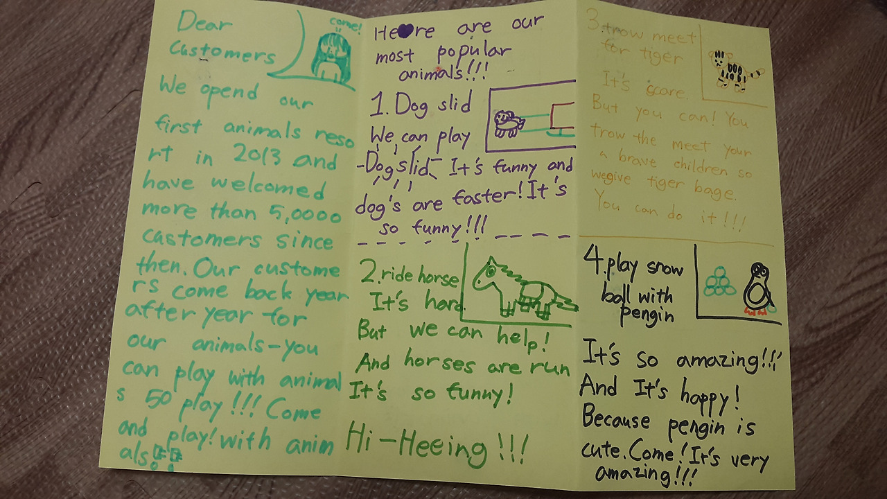 나의 상황을 정확하게 알고 인정하는 것! 학부모님들에게는 대형학원을 그만두고 작은 공부방에 보내는 것이 상당한 고민거리가 아닐 수 없다. 그래서 우리의 첫 프로그램은 여름방학 캠프로 결정했다. 기존 학원들은 오후에 진행되니, 오전에 공부방에 와서 프로그램을 경험해 보고 결정을 할 수 있는 선택권을 주는 것이었다. 그리고 여름방학 오전에 아이들이 늦게 일어나거나 집에 늘어져 있는 것보다는 즐겁게 영어를 배울 수 있는 곳을 가는 게 얼마나 좋은가! 25명 이상의 학생들이 등록을 했는데, 사실 아파트 같은 라인에 살고 있는 아이들이 6명이나 왔다.