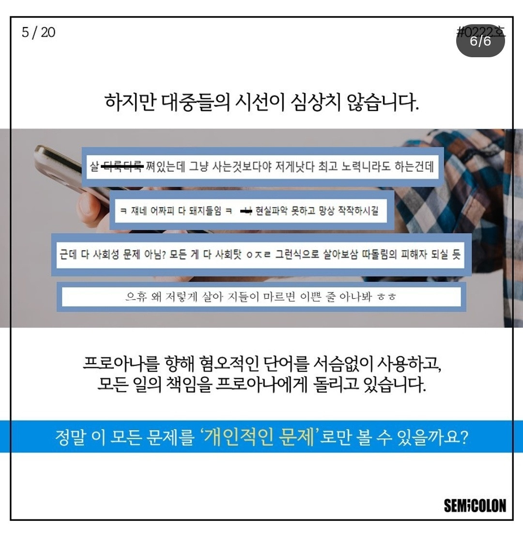 최근 같은 여성에게 가장 많은 비난의 목소리를 듣고 있는 여성 집단 중 하나는 프로아나 (proana, 이하 ‘프아’)라 할 수 있겠다. 프아는 그 명칭부터가 proanorexia의 준말로, 찬성을 의미하는 접두어(pro-)와 거식증(anorexia)의 합성어이다. 이름을 통해서는 단순히 거식증을 찬성하는 집단이라고 생각할 수 있으나, 극단적인 마름과 효율적인 다이어트를 위해 거식증의 증세를 모방한다는 점을 보았을 때 이들의 거식증에 대한 감정은 ‘동경’에 가깝다. 가부장제적 사회에서 이상적인 여성성으로 추구되는 ‘마름’을 선망하고 그를 위해 극단적인 방법을 수행하는 모습은, 언뜻 보면 가부장제의 논리에 순응하여 적극적으로 여성혐오를 재생산하는 행위 로도 여겨진다. SNS상의 많은 여성이 규범적인 여성성에 저항하여 ‘탈코르셋’을 실천하는 현재에 이들의 입장에서 보면 역적이 아닐 수 없다. 여기에 정신 질환인 거식증을 동경함으로써 실제 거식증 환자에게 실례라는 점도 더해진다.