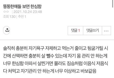 개별적인 차이가 존재하겠지만 프아가 이토록 극단적인 행위를 취하게 된 까닭에는 혐오에서 벗어나고 싶은 마음이 작용하는 상황이 많다. 그러니 이들도 알고 있다. 사회의 ‘마름 추구’가 부적절함을. 그러나 그로 인해 더 이상 고통받고 싶지 않으므로 언제가 될지 모르는 사회 인식의 변화를 기다리기보다는 자신을 규범에 맞추어 혐오를 회피하고자 한다. 그렇기에 이들이 사회를 욕하는 맥락에는 이러한 배경을 참고하여 논할 수 있으면 좋겠다. 여기에서는 왜 평범하게, 일반적으로 여겨지는 다이어트를 하지 않고 극단적인 행위를 수행하는가 하는 비판이 존재할 수 있다. 프아의 대부분은 프아가 되기 전 사회에서 일반적으로 여겨지는 다이어트를 했다. 그러다 어느 순간 극단적 다이어트를 접하고, 효율의 차이를 느낀 경우가 다수이다. 최소 10킬로는 빼고 싶은 상황에서, 자신은 한 달에 3킬로를 겨우 빼는데 한 달 만에 15킬로도 뺄 수 있는 최고 효율의 방법을 알게 된 이에게 건강은 소비재가 된다. 혐오에서의 탈출이 이미 대부분의 행동 목적이 됐기 때문이다. 이제 이들이 최고 효율로 최고의 성취를 낼 수 있는 방식을 따르게 되는 결과는 자명해 보인다.