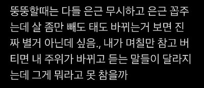 프아는 ‘평범하게’ 마르고 싶어 하지 않는다. 비정상적으로 말랐다고 인식되기를 바란다. 우리는 종종 전략적인 방법으로 아픔을 드러내기를 택한다. 아플 때 별다른 이유 없이 학교에 빠질 수 있는 게 그 예이다. 이 관점에서 프아의 비정상적으로 인식되고 싶은 욕구는 내면이 지옥임에도 그 아픔이 간과되는 것이 아니라, 말하지 않아도 외부가 이를 인식했으면 하는 마음이 담겨있다고도 볼 수 있겠다. 이는 ‘자해계’의 성격도 띤다. 프아의 극단적인 행위가 자기가학적인 특성을 보이기에 더욱 연결 지어 생각해 볼 수 있다. ‘자해계’도 다수에게 비난의 대상이기는 하나, 관심을 얻기 위함이라는 욕 뒤에는 대상의 아픔을 인정하는 면이 있다. 무턱 대고 개인을 탓하기보다는 그의 배경을 고려하려는 시도가 따른다. 프아에게도 같은 사고를 해볼 수 있으면 좋겠다. 프아의 행위와 이상은 고통의 표출이다. 이 고통을 인식하고 고찰할 때 이들을 둘러싼 요소를 더욱 깊은 시각으로 바라볼 수 있겠다.