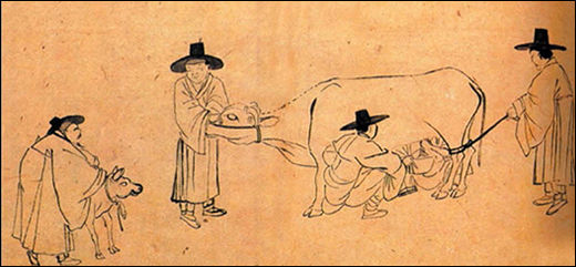 작품에는 어미 소의 젖을 짜기 위해 네 명이 동원된 모습이 나타난다. 두 명은 소의 머리와 다리를 붙들어 고정하고, 한 명은 그 사이 젖을 짠다. 그리고 나머지 한 명은, 어미 소의 앞에서 송아지를 붙들고 있는 모습을 볼 수 있다. 이는 어미의 젖을 짜는 동안 방해되지 않도록 하기 위해, 혹은 젖이 나오게 할 유인물로 추측된다. 어느 쪽이든 모녀, 혹은 모자의 소는 상당히 안쓰러워 보인다. 그리고 이런 감상은 영조에게도 마찬가지였나 보다. 『영조실록』에는 영조 25년, 1749년 10월 6일에 “내의원(內醫院)에서 전례에 따라 우락(牛酪, 치즈)을 올렸다. 하루는 임금이 암소의 뒤에 작은 송아지가 졸졸졸 따라가는 것을 보고 마음에 매우 가엾이 여기며 낙죽(酪粥)을 올리지 말도록 명하였다.”라는 기록이 존재하니 말이다.