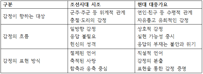위 표에서 보이듯, 조선시대 시조에서 사랑은 위계적 관계 속에서 정립된 감정으로, 절제와 품격의 이상에 따라 표현된다. 반면 현대 대중가요에서는 사랑이 수평적 관계와 실현 가능성을 기반으로 하여, 감정은 표현과 반응을 통해 성립되는 구조로 나타난다.