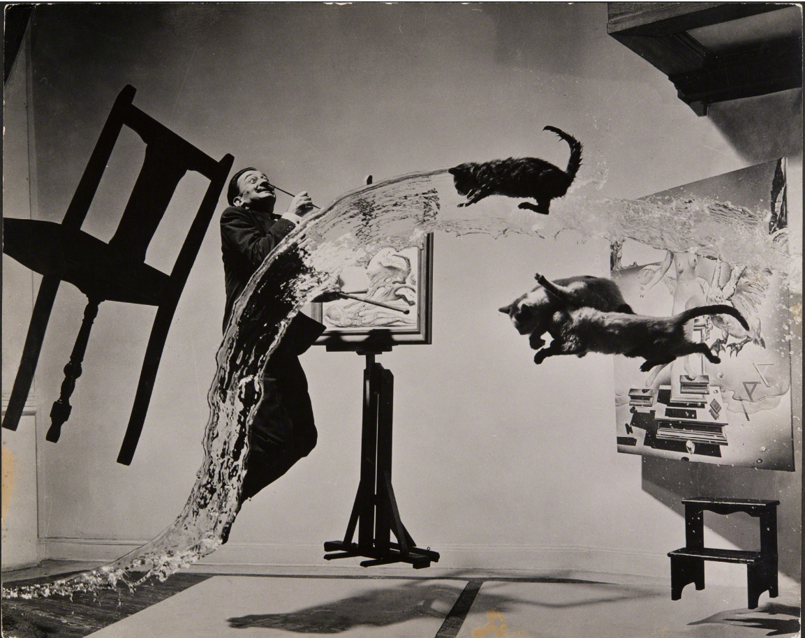 <달리 아토미쿠스>라는 제목의 이 사진은 28번 만에 찍은 사진이다. 사진 속 점프하고 있는 인물이 바로 달리다. 이 사진이 뭐가 그렇게 특별하냐 싶지만 참고로 할스만의 시대에는 포토샵이 없었다. 28번 동안 물을 쏟고 닦고, 아내에게 의자를 들고 서있게 하고, 고양이를 던지면서까지 이 사진을 남기고 싶었던 이유는 바로 달리가 그리는 ‘그림’ 때문이었다.