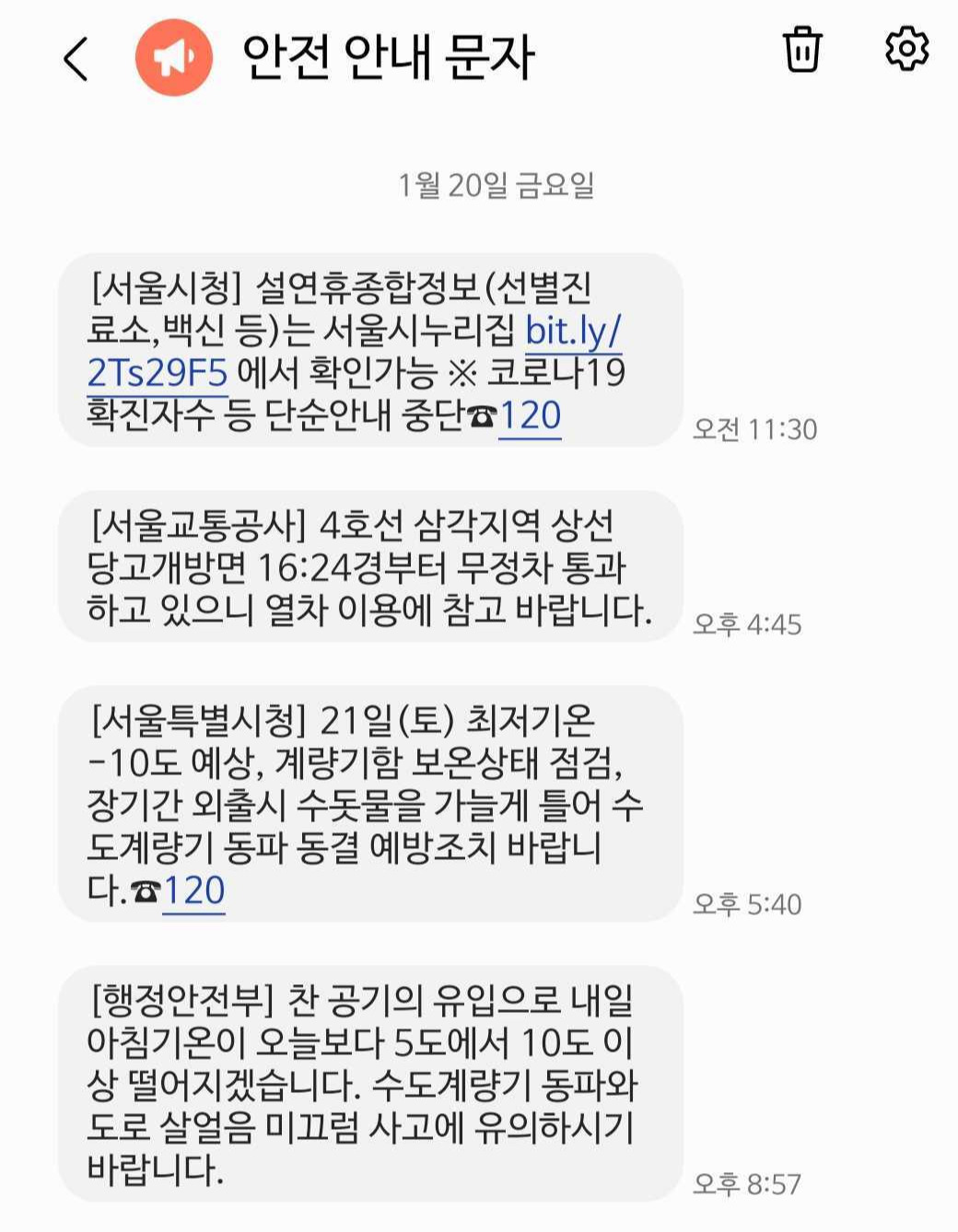 서울시청, 서울교통공사, 행정안전부 등으로부터 온 재난 문자