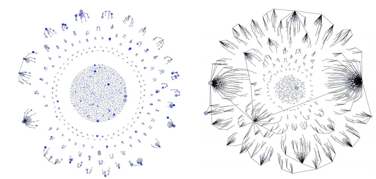 아래의 그림을 들여다보자. 트윗 메세지들의 연결 관계를 표현한 것이다. 누군가의 메세지에 반응했다면 나와 그의 메세지는 서로 선으로 이어진다. 아래 그림은 메세지의 연결 관계를 보여주는 것이다. 그런데 이 그림 가운데, 하나는 사실이고 하나는 루머에 관련된 이야기를 그래프로 그려낸 것이다. 한 눈에도 루머와 사실 관계에 관한 양상이 다른 모양인 것을 발견할 수 있다. 어떤 것이 사실이고 어떤 것이 루머일까? 잠깐 생각해 보자.