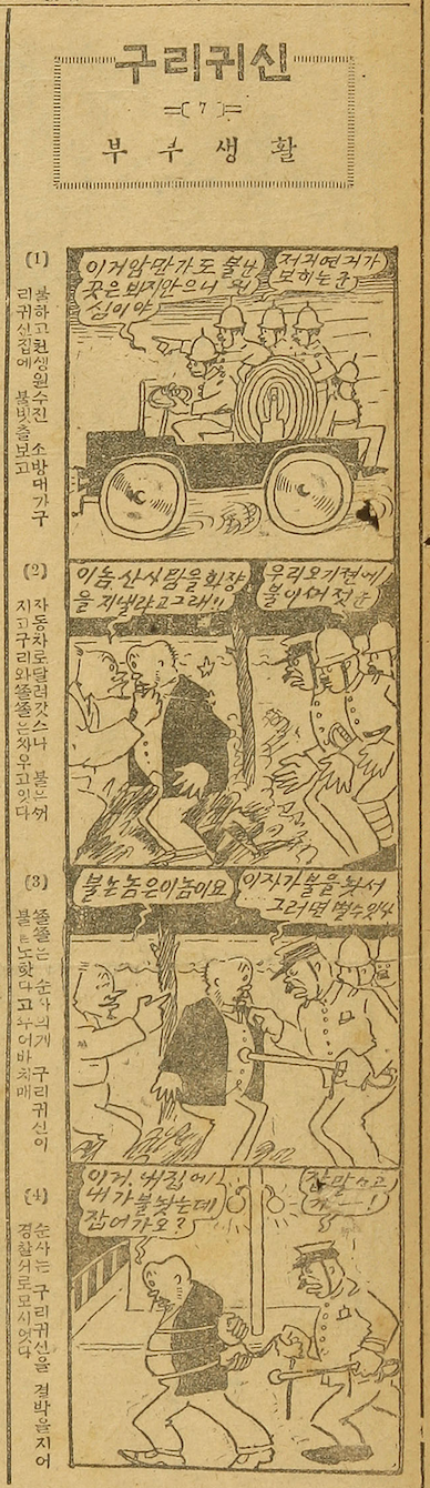 인쇄가 정확하지 않아 제대로 확인이 어려우나, 정황상 쫄쫄이는 순사에게 “불 지른 놈은 이놈이오!”라며 구리귀신을 일러바친 듯합니다. 감정적 고발이지만, 현장 진술로는 방화 혐의를 판단하는 출발점이 됩니다. 순사의 “그러면 별 수 있나”는 현행 절차에 따른 즉시 조치, 곧 신병 확보와 기초 조사로 넘어가겠다는 뜻입니다. 당시 소방과 경찰은 한 지휘선에서 움직였기에, 진압 직후 사법 절차가 바로 이어지는 장면이 자연스럽습니다.