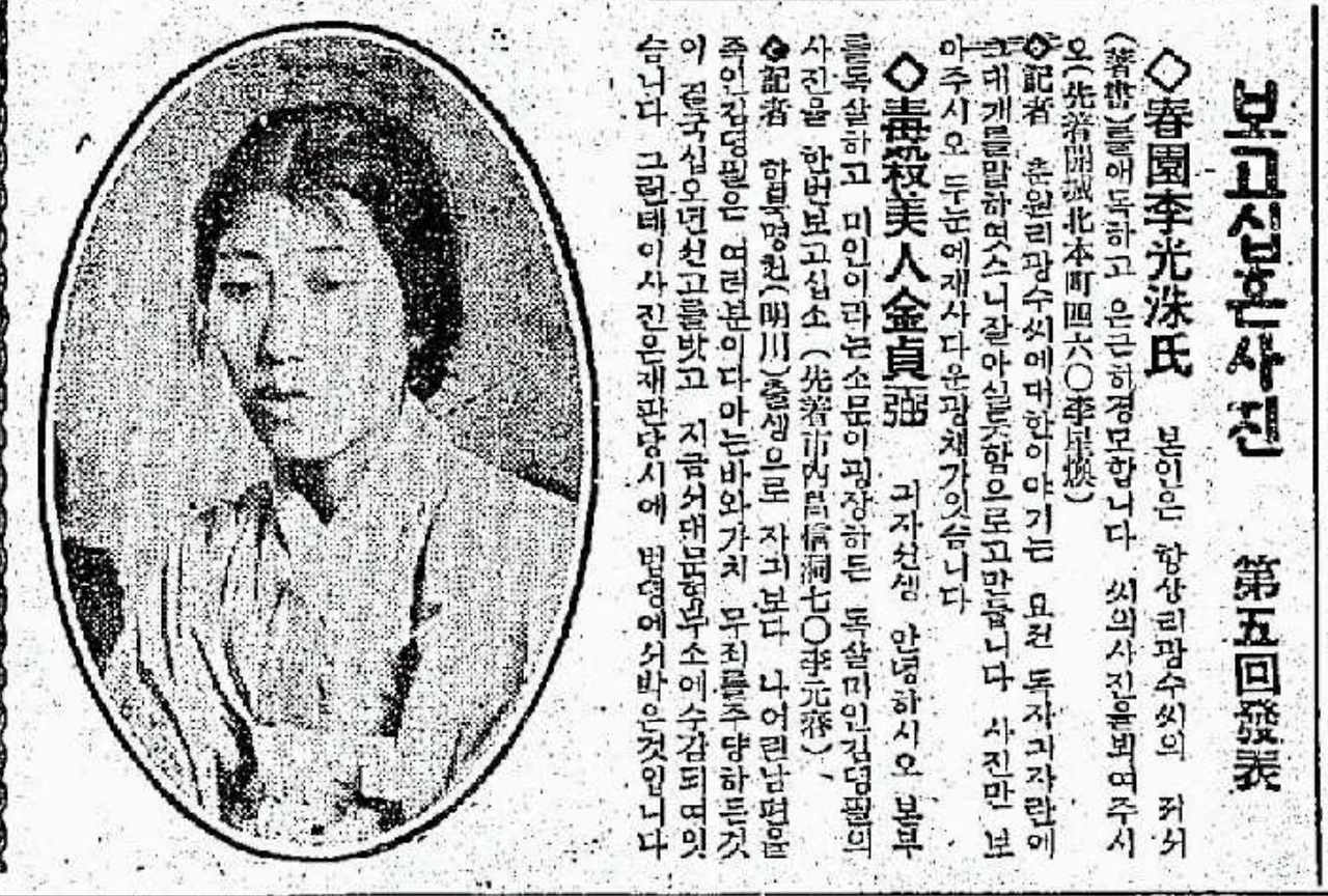 1924년 ‘김정필’이라는 여성이 남편을 살해한 사건이 신문에 크게 보도되며 사회적 파장을 일으켰습니다.