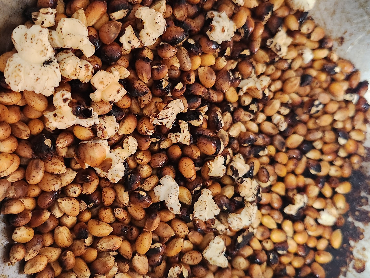 기대에 가득 찬 아이들의 눈빛을 기억한다. 두구두구두구. 걱정은 현실이 됐다. 아니나 다를까 옥수수알의 1/4 정도만 겨우 터졌는데 그마저도 너무 오랜 시간 열을 쐤는지 탄 상태였다.