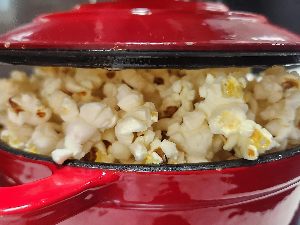 아이들도 "엄마. 이제 성공이야!"라며 기뻐했다. 원래도 두꺼운 팔뚝이 두 배가 되도록 무쇠솥을 흔들었다. 됐겠다 싶어서 뚜껑을 열었을 땐, 넣은 옥수수알에서 반 정도 튀겨진 팝콘을 만날 수 있었다. 이 정도면 완벽하진 않아도 나름 괜찮았다.