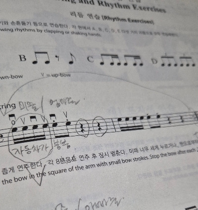 첫날 배운 것은 개방현(아무 음도 누르지 않은 상태)을 기준으로 각 현의 이름과 계이름을 익히는 것이었다. 가장 굵은 G현부터 가장 얇은 E현까지. 활을 들고 각 현만을 그어 위치와 소리를 익히는 것이다.그 이후엔 각 현의 음을 운지하며 계이름에 맞춰 소리 내는 연습을 한다. 일반적인 레슨과는 다르기 때문에 지휘 선생님이 한 번씩 다니시면서 기본을 알려주시면 그 이후는 개인의 몫이다.