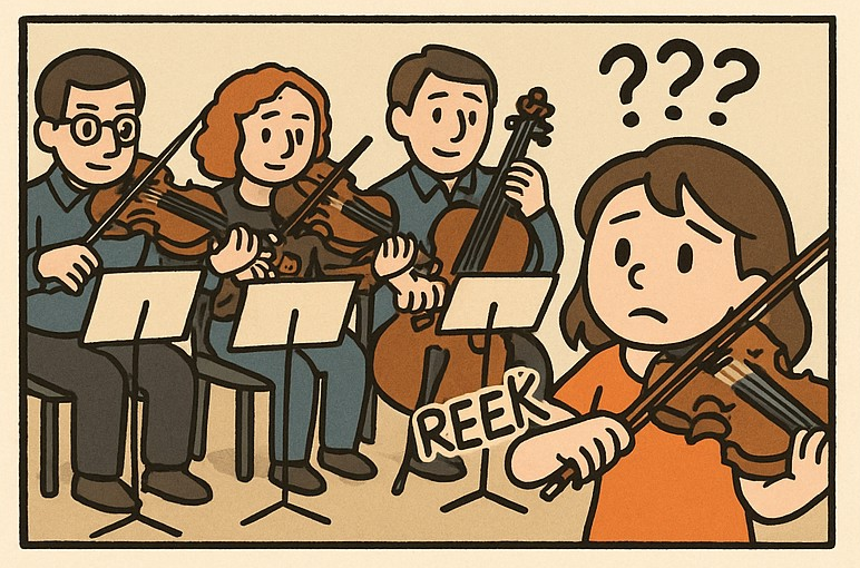 합주 내내 나 혼자 얼마나 한숨을 쉬었는지 모른다. 음은 계속 어긋났고, 활은 엉뚱한 경로에서 헤매고 있었으며, 연신 삑삑 대는 소리가 귀를 찔렀다. 민망함에 웃고는 있었지만, 그 웃음은 경련처럼 어색하게 얼굴에 걸려 있을 뿐이었다.