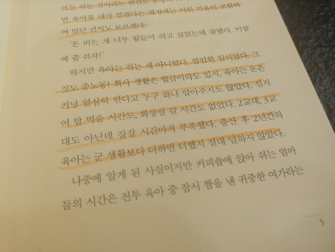 나는 남편에게 일찍 퇴근해 들어와 아이를 돌보라고 강요하고 싶진 않다. 회식에도 가지 말고 일찍 들어오라고 잔소리하고 싶지도 않다. 그건 우리나라에선 현실상 불가능한 일이다. 도준형 작가처럼 겸임교수도 하고 마케팅 회사도 운영하고 강의도 다녀서 하고 있는 일의 일부를 접고 육아에 참여할 수 있는 아빠들은 많지 않을 테니까.
