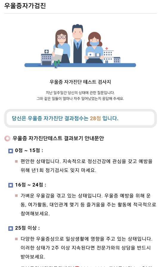 첫 번째 자가진단에서 28점이 나왔다. 내 생각에 100점 기준에서 28점이면 낮은 수치라고 생각했다. 결과는 의외였다.