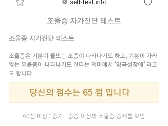 이번엔 65점이었다. 중증 이상의 조울증 증세를 보인다고.