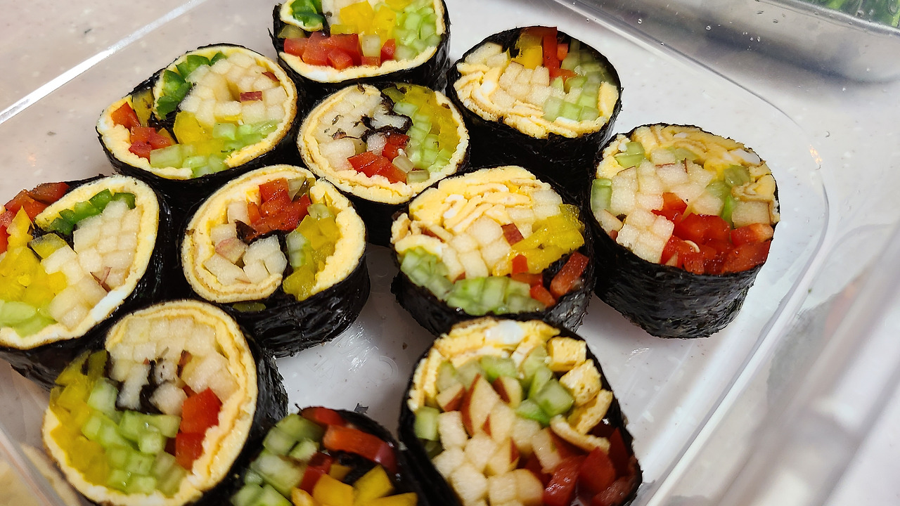 그렇게 시간이 흐르고, 어느 주말. 저녁으로 기름 없이 구운 두부를 밥 대신 사용한 김밥을 말았다. 속으로는 채 썬 파프리카와 오이, 계란 지단을 넣었다. 남편은 그 ‘두부채소김밥’의 사진을 찍어 회사 단톡방에 올렸고 순식간에 화제가 됐다. 어떻게 두부로 그런 걸 만들 수 있냐고 놀라움과 칭찬이 계속 ‘카톡’거렸다. 으쓱했다.