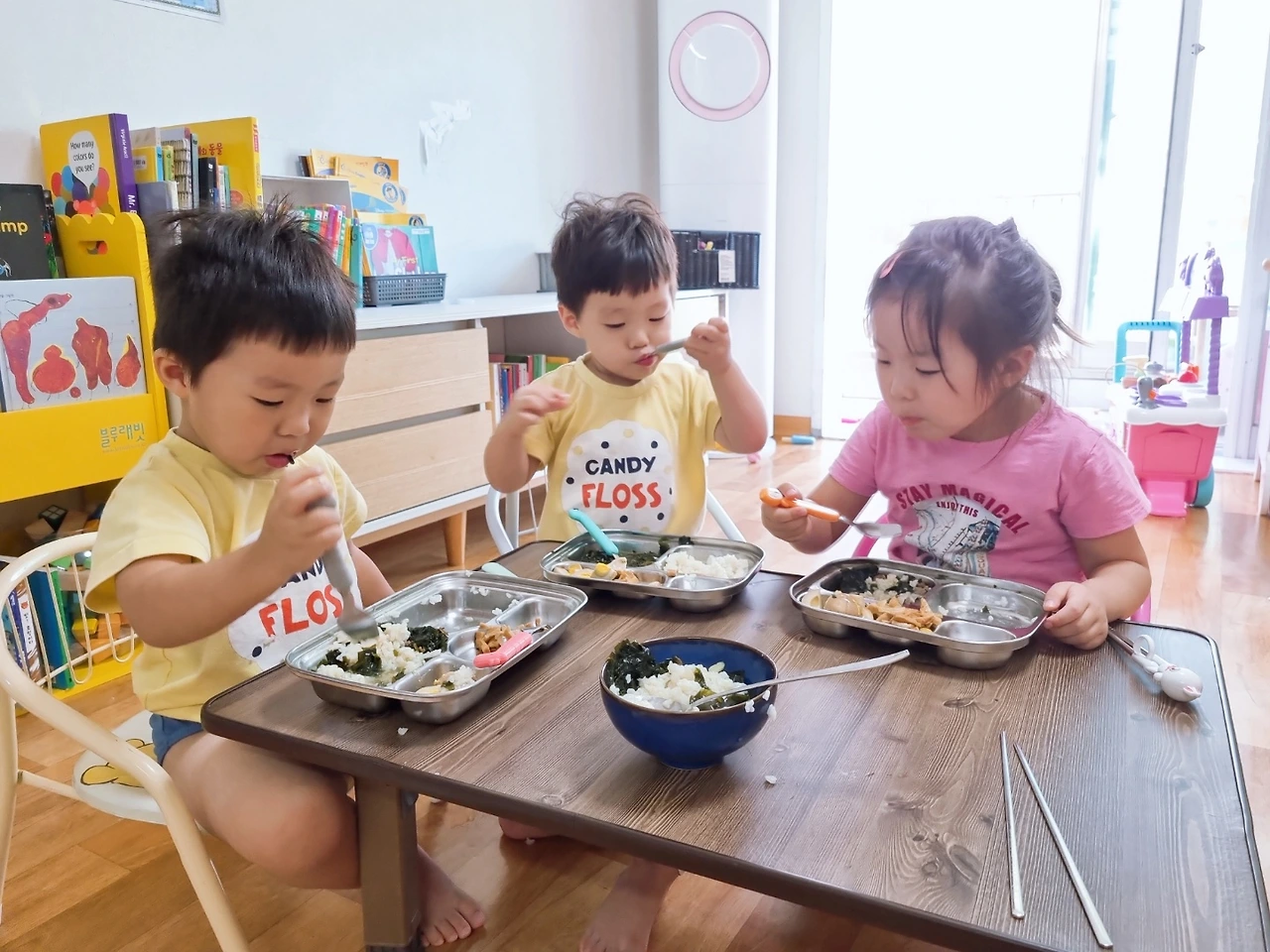 오후 2시쯤 되면 집중력이 떨어지고 허기가 진다. 점심을 간단히 먹고 남편이랑 통화한 후에는 저녁에 아이들 먹일 것들을 준비한다. 밥을 새로 안치고 반찬을 확인한다. 있는 반찬을 보고 부족한 게 있으면 한 두 개는 간단하게 만든다. 4시가 되면 옷을 갈아입고 물과 간식을 챙겨 하원을 간다. 어린이집으로 가서 둥이를 데리고 킥보드를 하나씩 타게 해서 첫째가 있는 유치원으로 몰고 간다. 첫째까지 하원하면 셋을 몰고 집으로 들어온다. 우르르 들어온 아이들의 손을 씻고 간단히 과일을 먹고 밖에서 입은 옷을 벗겨 내복 바람으로 두면 아이들의 얼굴에 긴장이 풀린다. 집에 온 게 즐거운 아이들을 안아주면 아이들의 따스한 온기에 나의 긴장도 녹는다. 내복 바람으로 이리저리 돌아다니다가도 쌍둥이들은 내 다리에 서로 먼저 앉겠다고 엉덩이를 들이민다. 첫째는 유치원 가방을 열고 친구들과 서로 주고받은 편지를 꺼내며 조잘조잘 이야기한다. 이런저런 얘기를 나누다 보면 저녁시간. 거실에 상을 펴고 식판 세 개에 밥과 국과 반찬을 담아 하나씩 앞에 주고 둘러앉는다. 유치원 이야기를 하며 한 입 먹고, 어린이집 이야기를 하며 두 입 먹고, 돌아다니지 말고 먹으라고 잔소리도 했다가, 잘 먹는다고 칭찬도 해주고, 정신없이 잘라주고 먹여주다 보면 식판이 어느새 비었다. 잘 먹고 배가 통통해진 아이들을 보면 오늘의 할 일을 다 했구나 싶다.