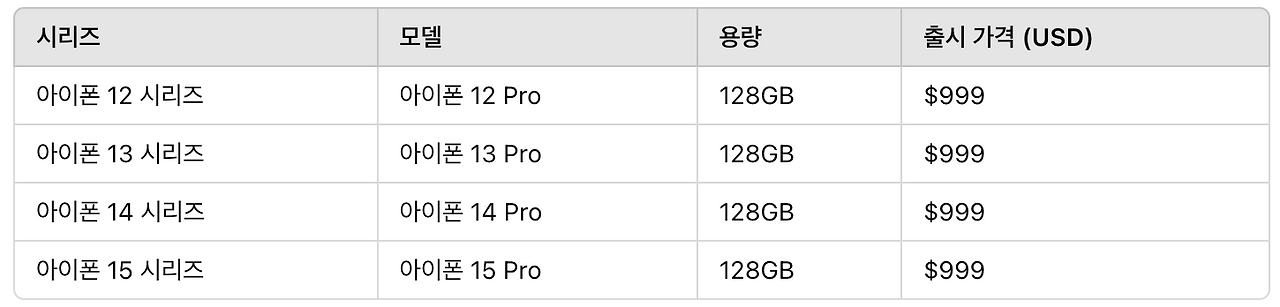 그리고 그 이후 출시된 아이폰 12~15까지 Pro 모델의 가격입니다.