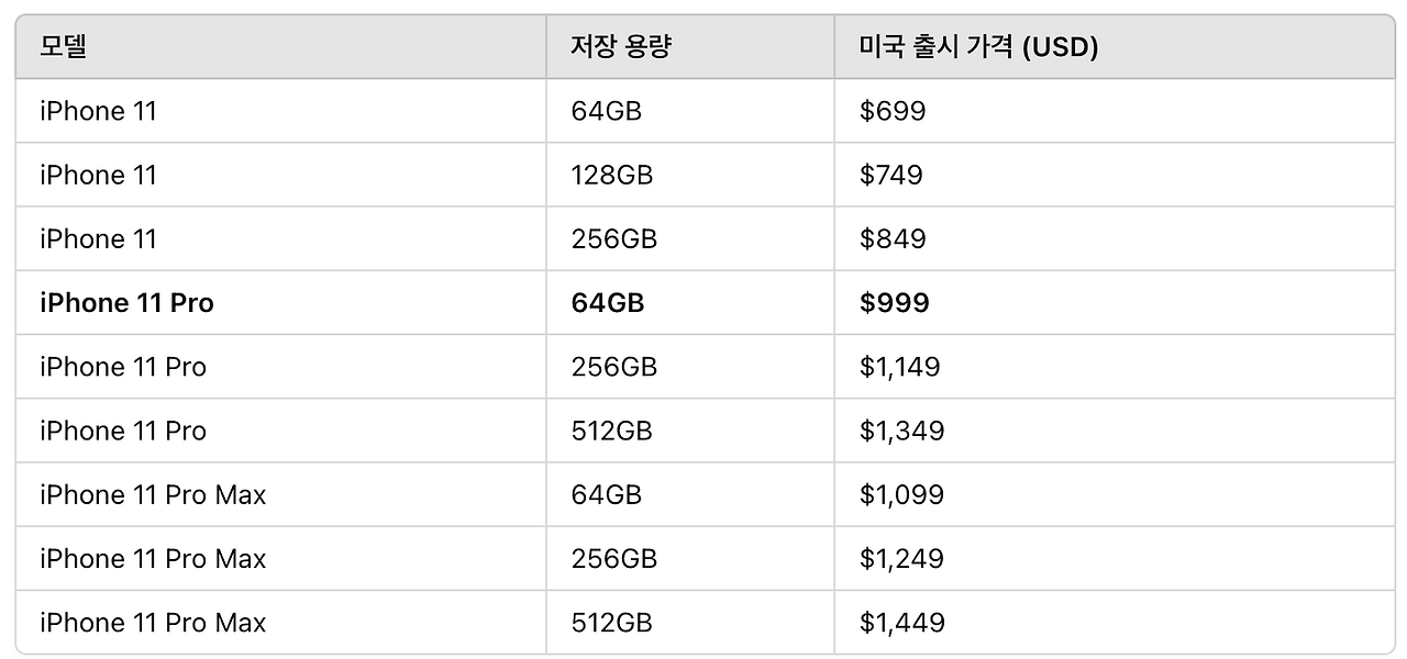 그리고 2년 뒤 2019년 출시된 아이폰 11의 가격입니다.
