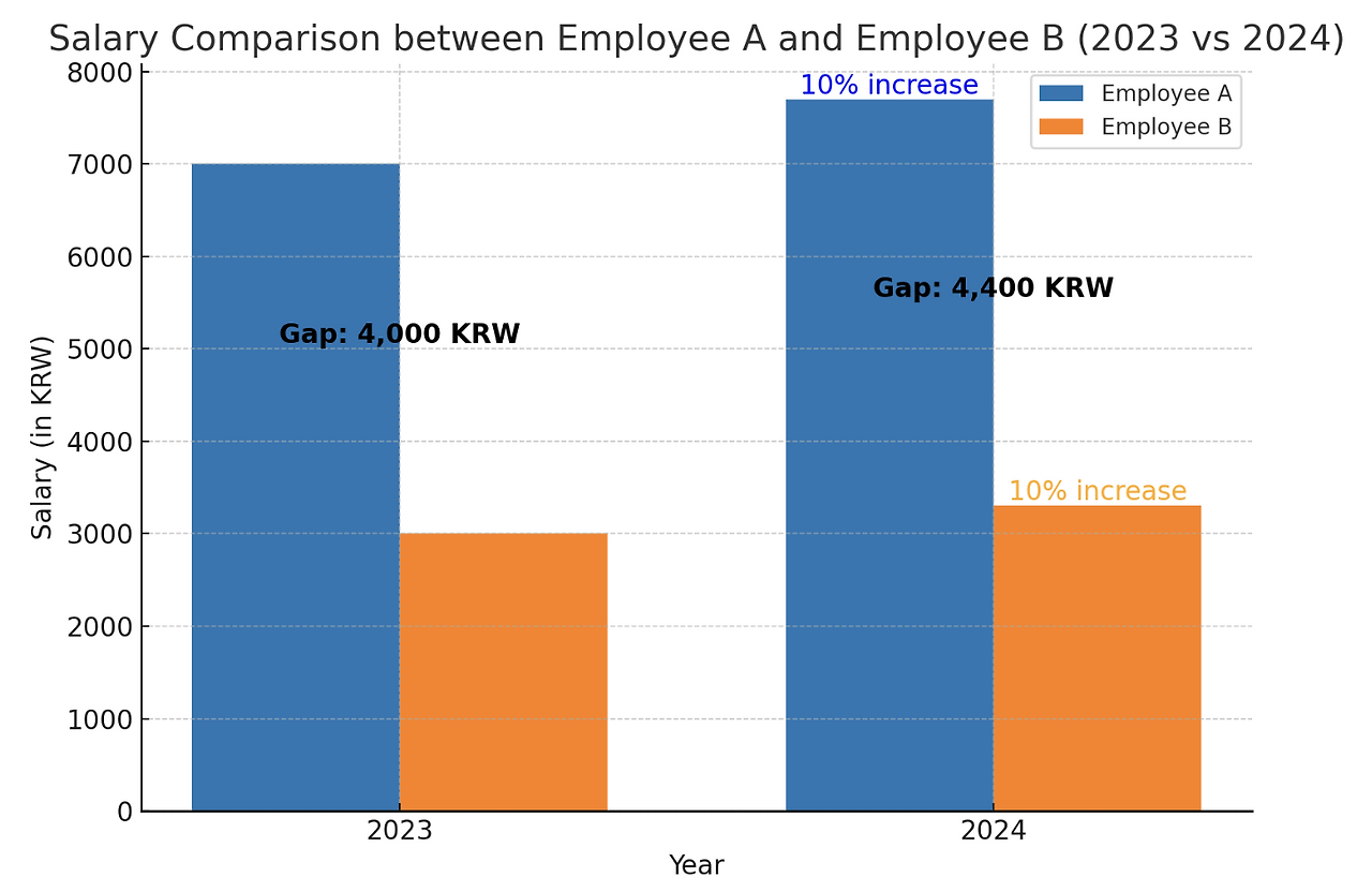 따라서 그에게 연봉 7천만 원인 직원과 동일한 연봉 10% 인상 제안은 공평한 것이 아니라 두 직원 사이의 Gap을 4천만 원에서 4천4백만 원으로 늘리는 참담한 제안입니다.