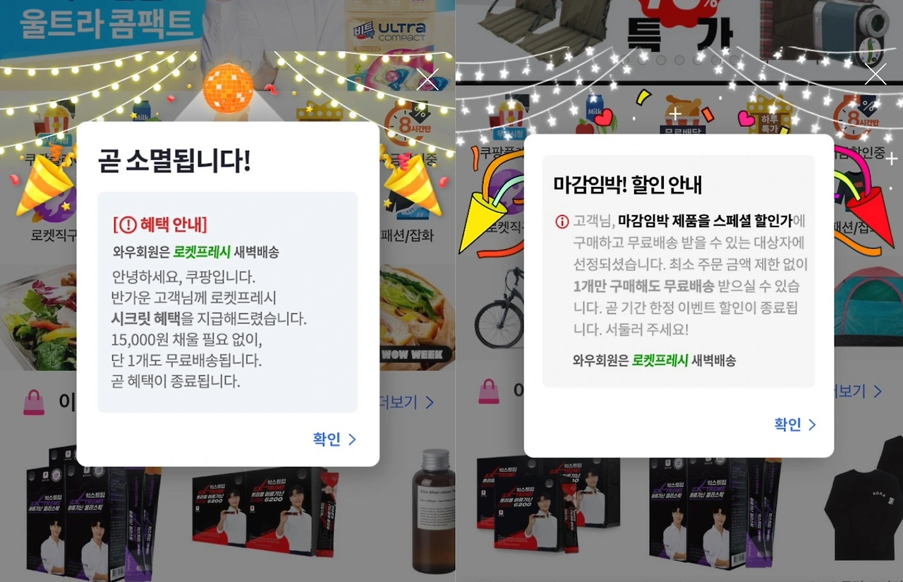 두 팝업은 쿠팡 로켓프리시 무료 배송을 '시크릿하게'(좌), '특별히 선정'하여(우) 지급했다는 내용입니다.