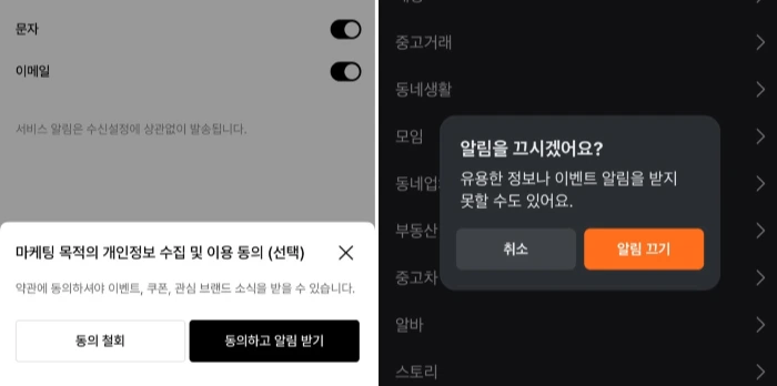 무신사와 당근 두 플랫폼에서 알림 설정을 끌 때 나오는 팝업입니다.