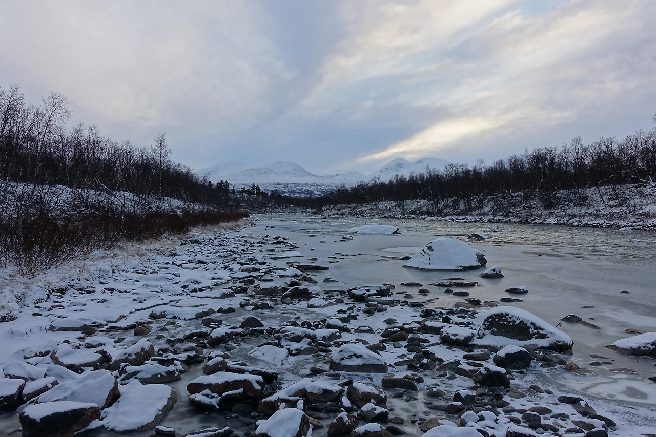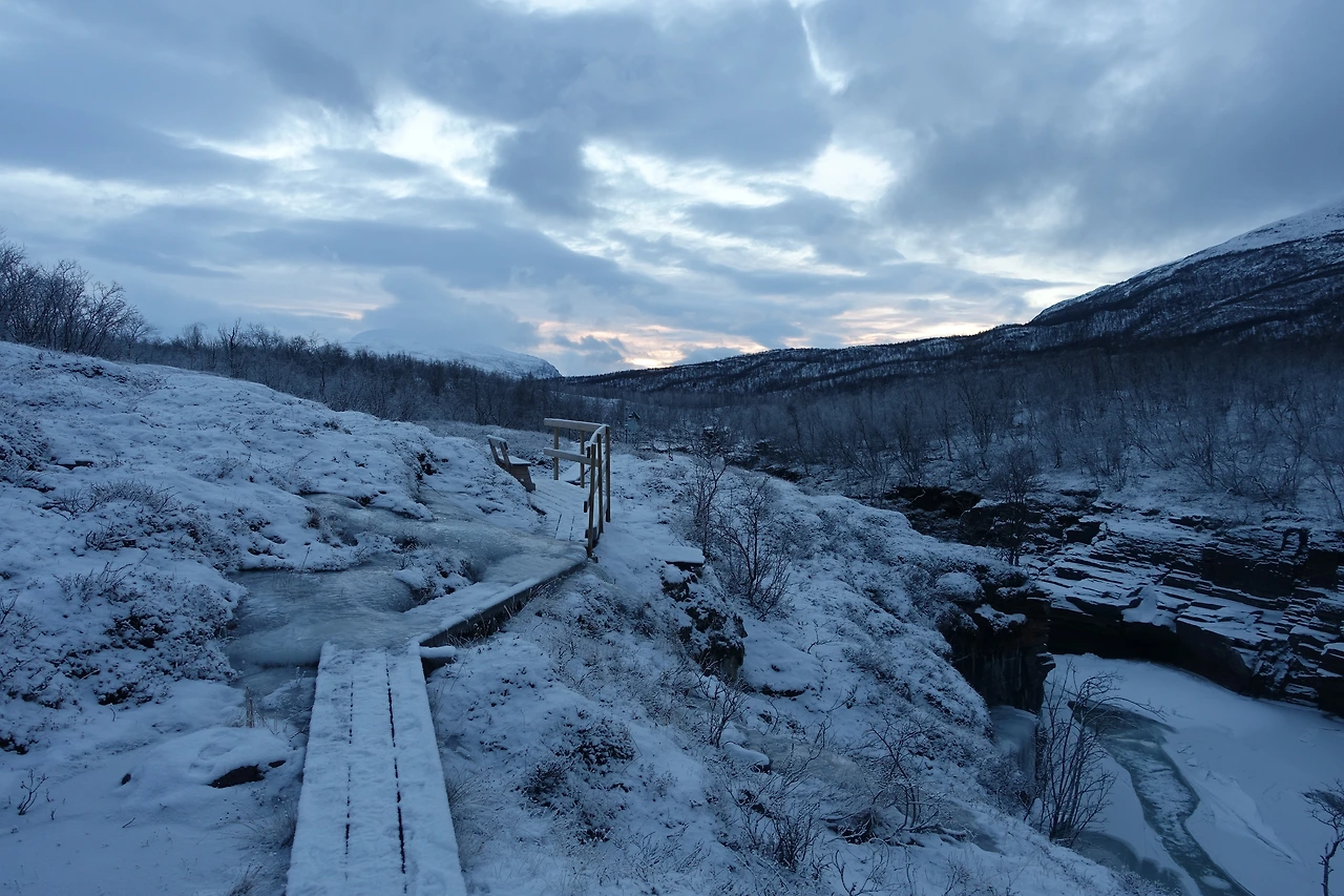 다시 발길을 돌려 아비스코의 유명한 하이킹 코스인 왕의 길(Kungsleden)을 따라 걸었다. 약 30분 정도를 걸었을까. 얼어버린 개울가가 나오고 그 뒤로 눈 덮인 산과 흐린 하늘을 뚫고 약간의 빛이 모습을 드러냈는데 그 모습이 진풍경이었다. 북극권 넘어 개울과 바위, 산과 나무 모든 것이 눈에 덮이고 하늘마저 눈 덮인 이곳. 나를 멀리서 물끄러미 바라보고 있는 저 산 뒤에는 과연 무엇이 있을까? 천국? 아버지? 내가 살아오면서 찾으려 했던 것들에 대한 정답들? 방금전까지만 해도 죽음의 땅을 운운했었는데, 이곳은 마치 눈 덮인 천국과도 같았다. 한동안 여유를 가지고 그 모습을 바라보았다.