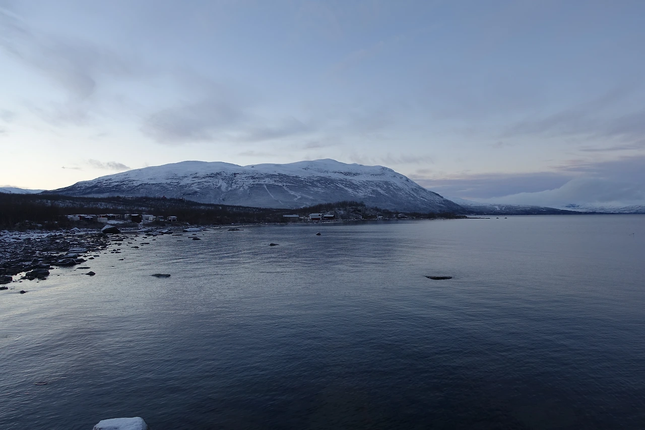 이튿날 조식을 먹은 후 정오가 되기 조금 전 리조트를 나왔다. 오후 3시가 되면 캄캄해지기 때문에 나에게 주어진 시간은 약 3시간뿐이었다. 리조트 앞에 내리막길이 있어 그 길을 따라 내려갔다. 한참을 걸어 내려가니 호숫가와 마주쳤는데, 그 모습이 너무나도 차가워 보였다. 하늘은 검회색이고 땅은 눈으로 덮여있었으며 산, 나무 그리고 모든 것들이 생명을 잃은 것처럼 메말라있었다. 검은 하늘, 검은 나무, 검은 호숫가는 북극권 넘어 이 땅이 마치 죽음의 땅인 것처럼 냉정하게 느껴졌다. 이 죽음의 땅에 아무도 없이 나홀로 적막하다. 재미있는 것은 그럼에도 불구하고 바닥에는 누군가가 지나간 발자국이 있다는 것이었다.