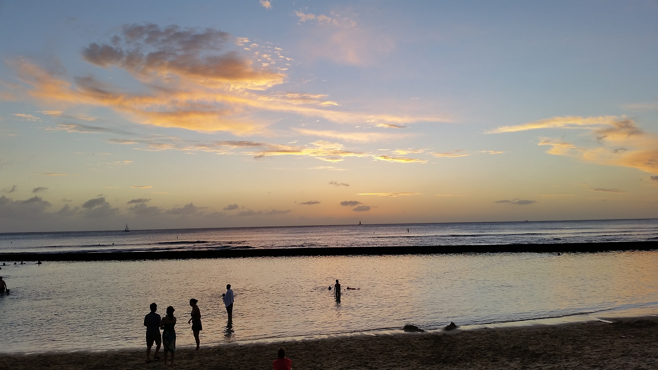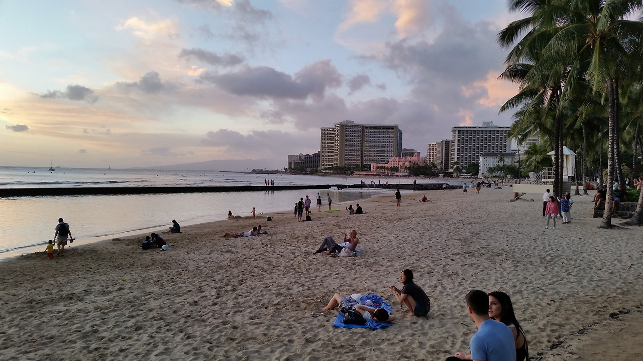몇 시간 지났을까? 눈을 떠보니 이미 늦은 오후의 해가 지기 시작한다. 방에는 아무도 없었다. 나는 조금 허기진 배를 채우기 위해 밖으로 나갔다. 편의점에서 간단히 끼니를 해결한 후 바닷가로 나갔다. 남국의 따스한 선셋. 많은 사람들이 바닷가에 나와 낭만스런 모습으로 수평선을 바라보고 있었다. 하염없이... 나도 지난 수개월동안 보지 못한 남국의 바닷가 선셋을 바라보았다. 주변에 보이는 야자수, 볼을 따라 스치는 따스한 바람, 짧은 옷과 수영복 차림의 사람들, 백사장에 타올을 깔고 선셋을 지켜보는 사람들이 너무나도 낭만적이었다. 연하늘색 그리고 연주황빛의 하늘이 점점 어두워지기 시작한다. 하와이를 방문한 모두에게 특별한 시간이었다. 이제 하늘이 점점 검게 변하면서 사람들은 하나둘씩 자리를 비우기 시작했다. 와이키키가 어두워지자 이제 시끌벅적한 파티시간이 시작되었다. 곳곳의 레스토랑, 몰, 펍, 바에 사람들이 가득 찼으며 와이키키는 축제의 분위기로 바뀌었다. 사람들의 웃음소리가 들려왔다. 그와 함께 혼자라는 고독함도 더 커져갔다. 하와이는 정말 여럿이 몰려와 놀기좋은 섬이다.