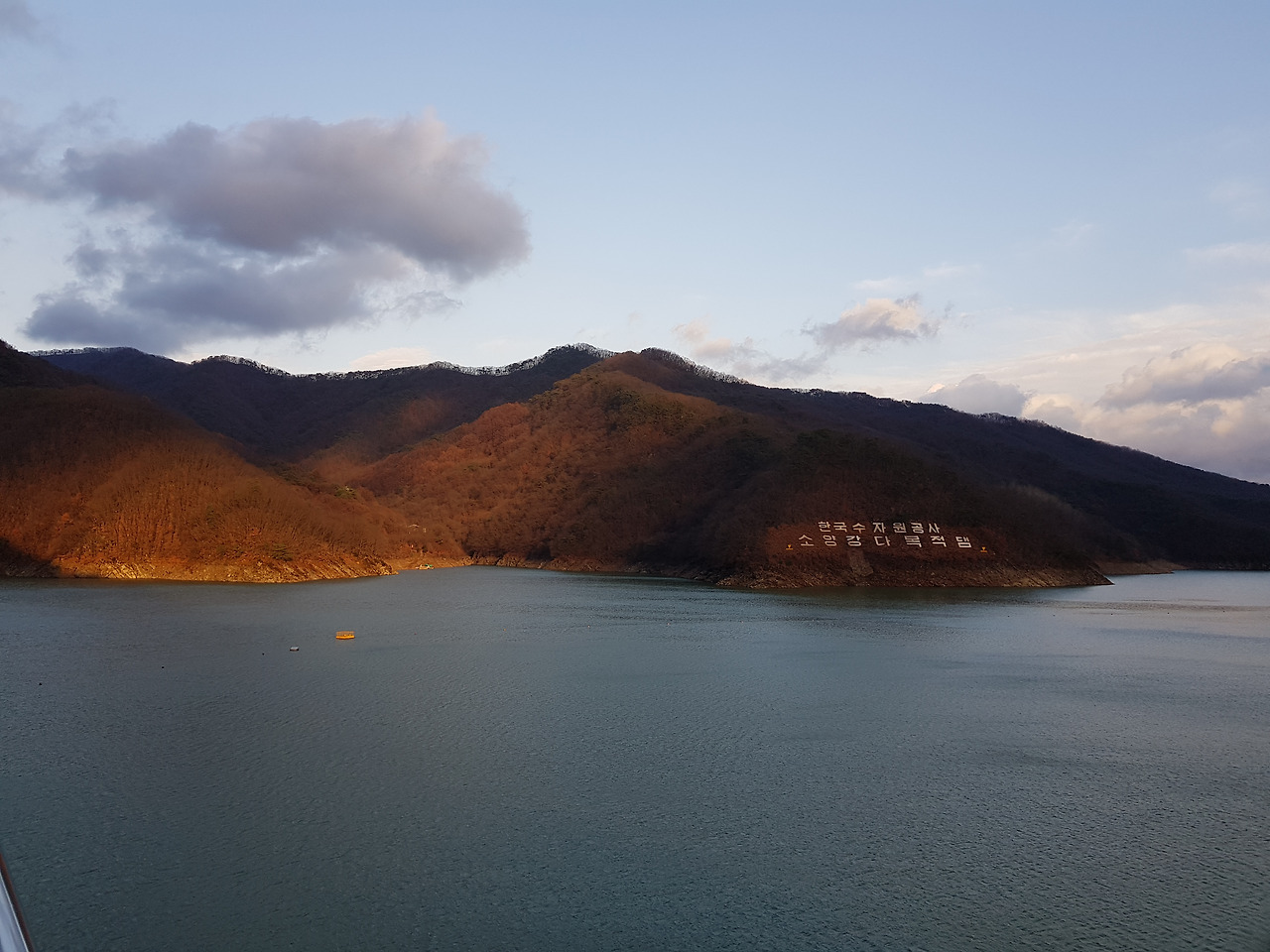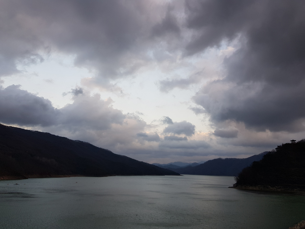늦가을 강원도의 해는 길지 않아 보인다. 5시가 조금 안 되었는데 어둑어둑해지기 시작한다. 이제 노랗기만 했던 빛이 진한 주홍빛을 띠며 호수 건너편 산을 비춘다. 산도, 산 위의 정자도, 호수도, 하늘의 구름도 그리고 하늘마저 검은색으로 변해가고 있는데, 주황색의 강렬한 빛이 산을 비추었다. 마치 무채색의 세상에 사람의 손길이 닿지 않은 그곳에만 색깔로 물들인 것처럼 보였다. 온기를 내려주는 듯했다.