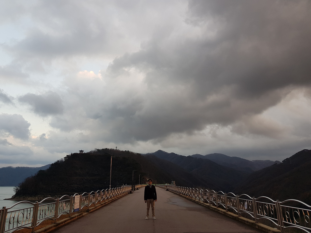 걷다 보니 어느덧 댐 위에 다다랐다. 그리고 마치 구름 가운데를 산책하듯 뭉게구름이 내 머리 위를 감쌌다. 발아래는 소양호의 물이, 내 뒤로는 산이, 머리 바로 위로는 구름이 신비로운 느낌을 자아냈다. 비가 오는 날이었기에 사람들 없이 한적한 이곳을 여유롭게 즐기고 있었다.