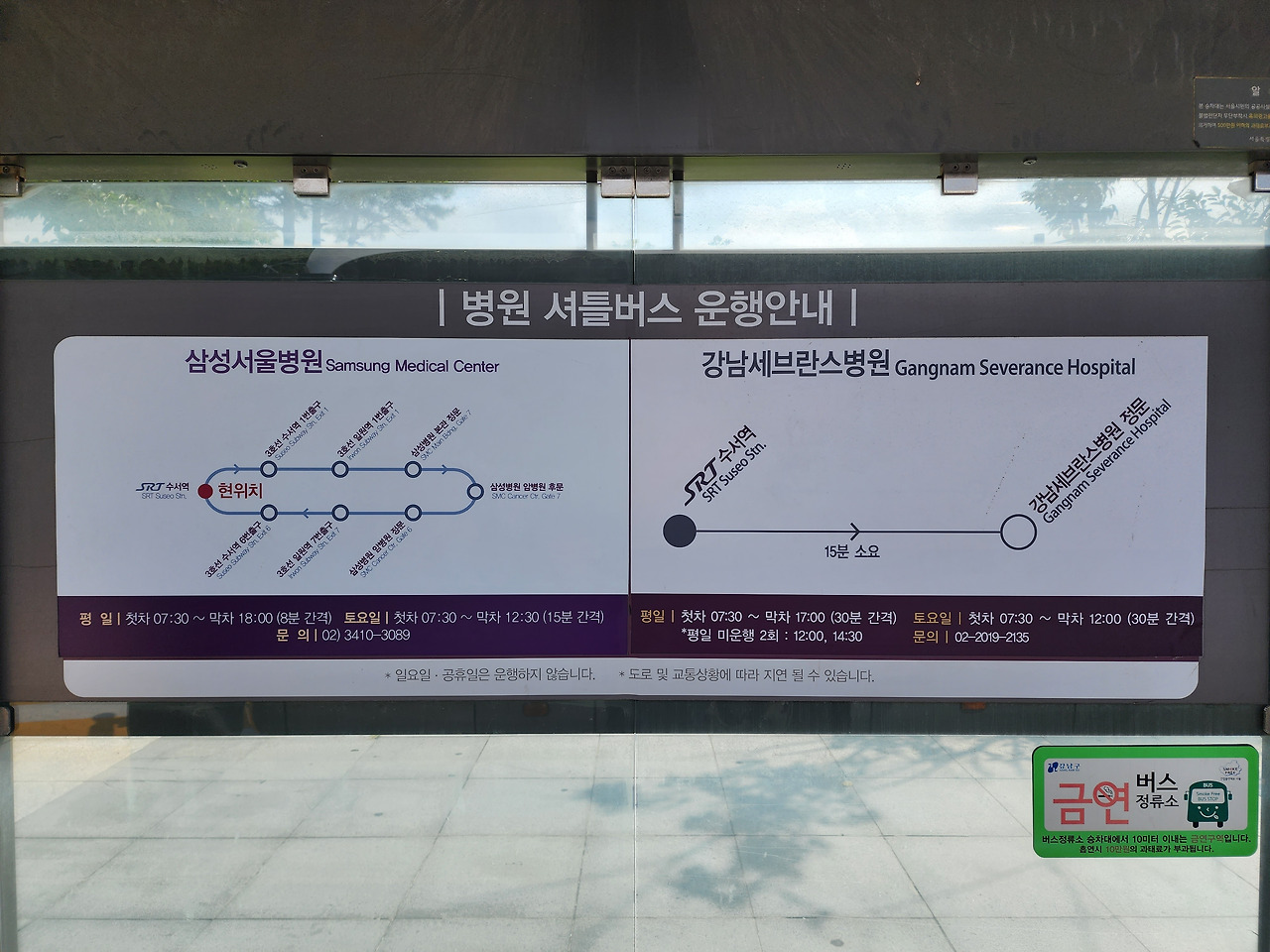 내가 사는 일원동에서 지하철 한 정거장 떨어진 곳에 수서역이 있다. 수서역은 SRT 정거장이 있는데 고속열차를 내리고 버스 정거장에 도착하면 몇 개의 무료셔틀버스 지도를 볼 수 있다. 삼성서울병원, 영동 세브란스병원의 셔틀버스 정거장 지도이다. 수서역에서 삼성서울병원과 영동 세브란스병원, 현대아산병원이 가깝기 때문에 서울에 주거하지 않으시는 분들이 많이 오신다.