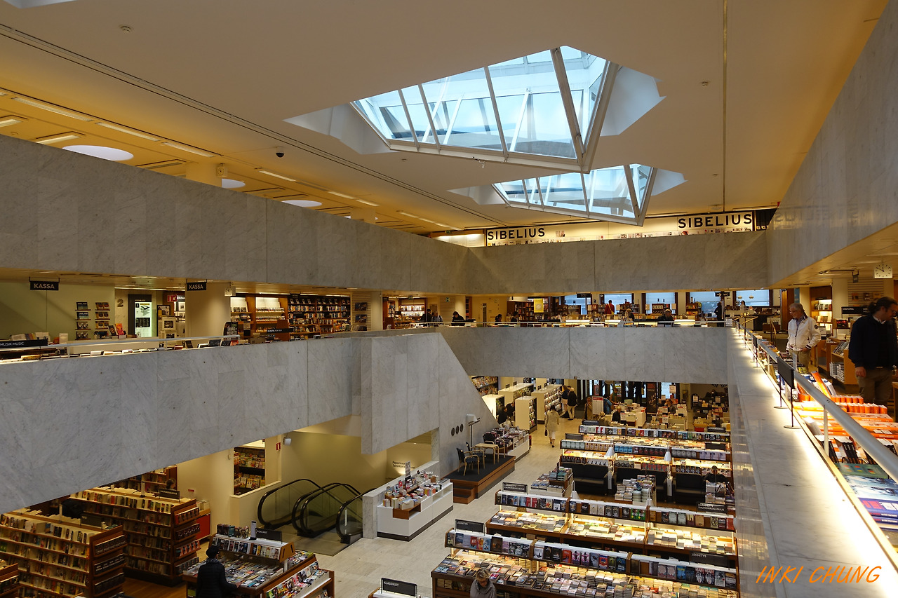 핀란드의 국민 건축가 알바르 알토(Alvar Aalto)의 설계로 건축된 헬싱키 중심가에 있는 서점이다. 자연채광의 활용을 즐겨하는 알바르 알토가 설계한 건물답게 중앙 천장의 창을 통해 들어오는 빛은 서점 내부를 고루고루 비추어 준다. 이러한 모습은 이곳을 단순 서점을 넘어서 핀란드 헬싱키 여행 또, 하나의 관광지로 만들어 주었다. 이 곳 카페에서 커피를 마시며 서점으로 들어오는 빛을 바라보면 어둡고 추운 북구에 내리는 한줄기 겨울햇살의 축복을 느낄 수 있다.