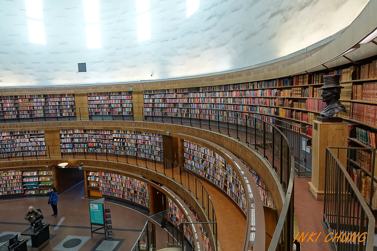 건축가 군나르 아스플룬드(1885~1940년)가 설계하여 1928년도에 건축된 스톡홀름 시립 도서관이다. 외관은 박스 위에 원통을 세워놓은 듯한 모습. 서재에 올라서면 360도 파노라마로 책에 둘러싸여 있음을 느낀다. 열려있는 공간이자그 어느 곳을 바라보건 똑같아 보이는 서재의 모습은 모든 것이 공평한 북유럽 사회를 떠오르게 한다.
