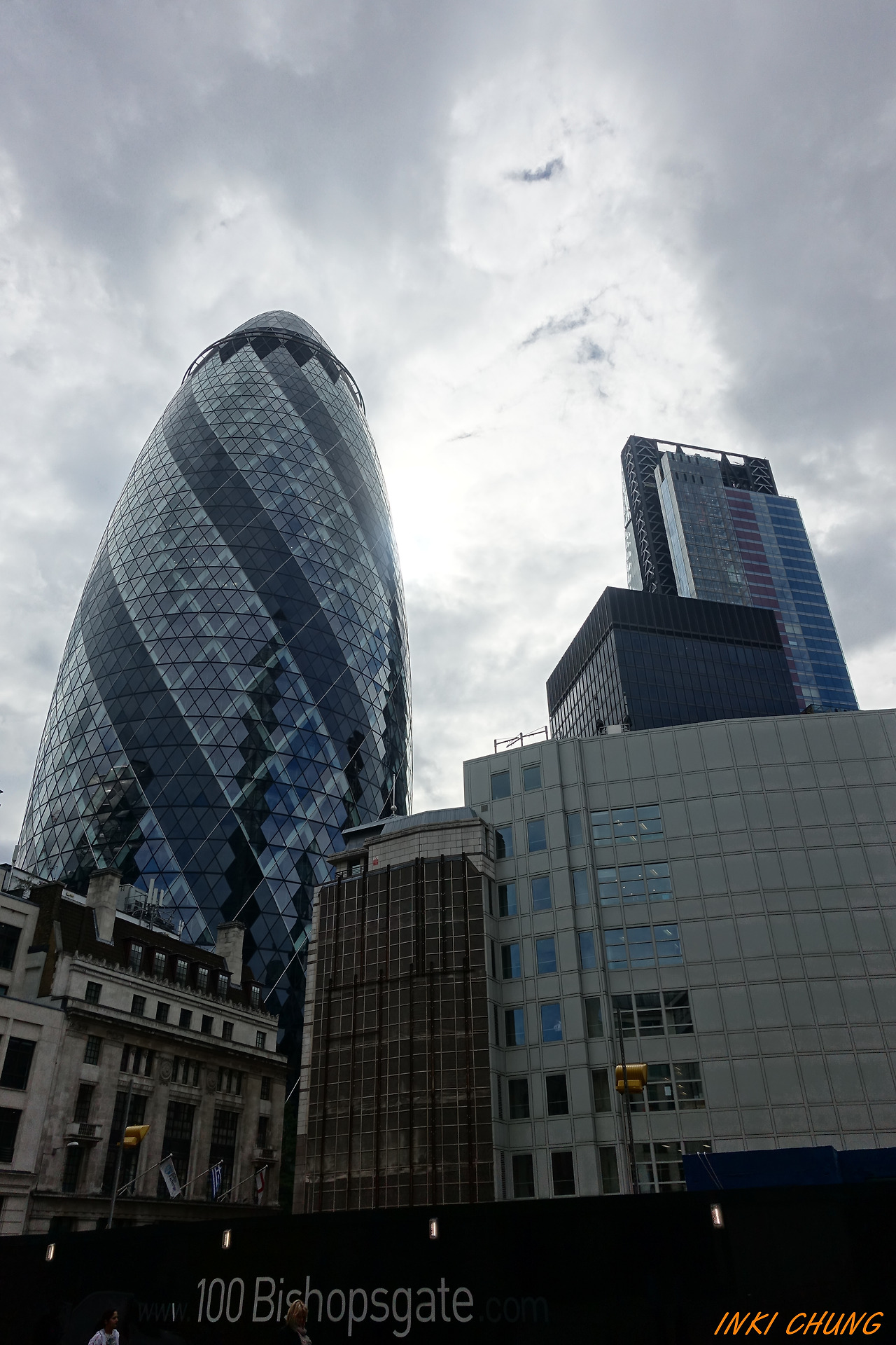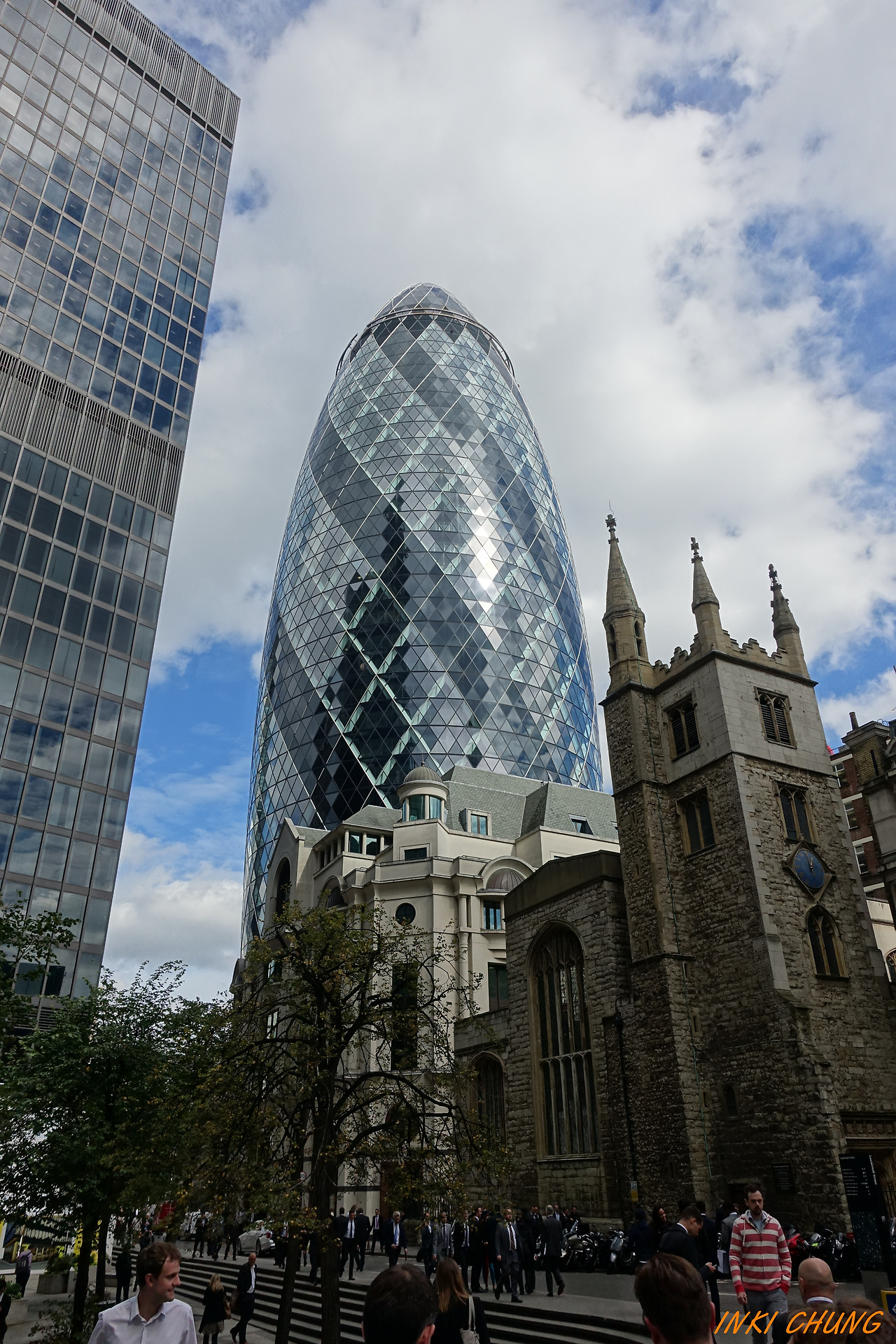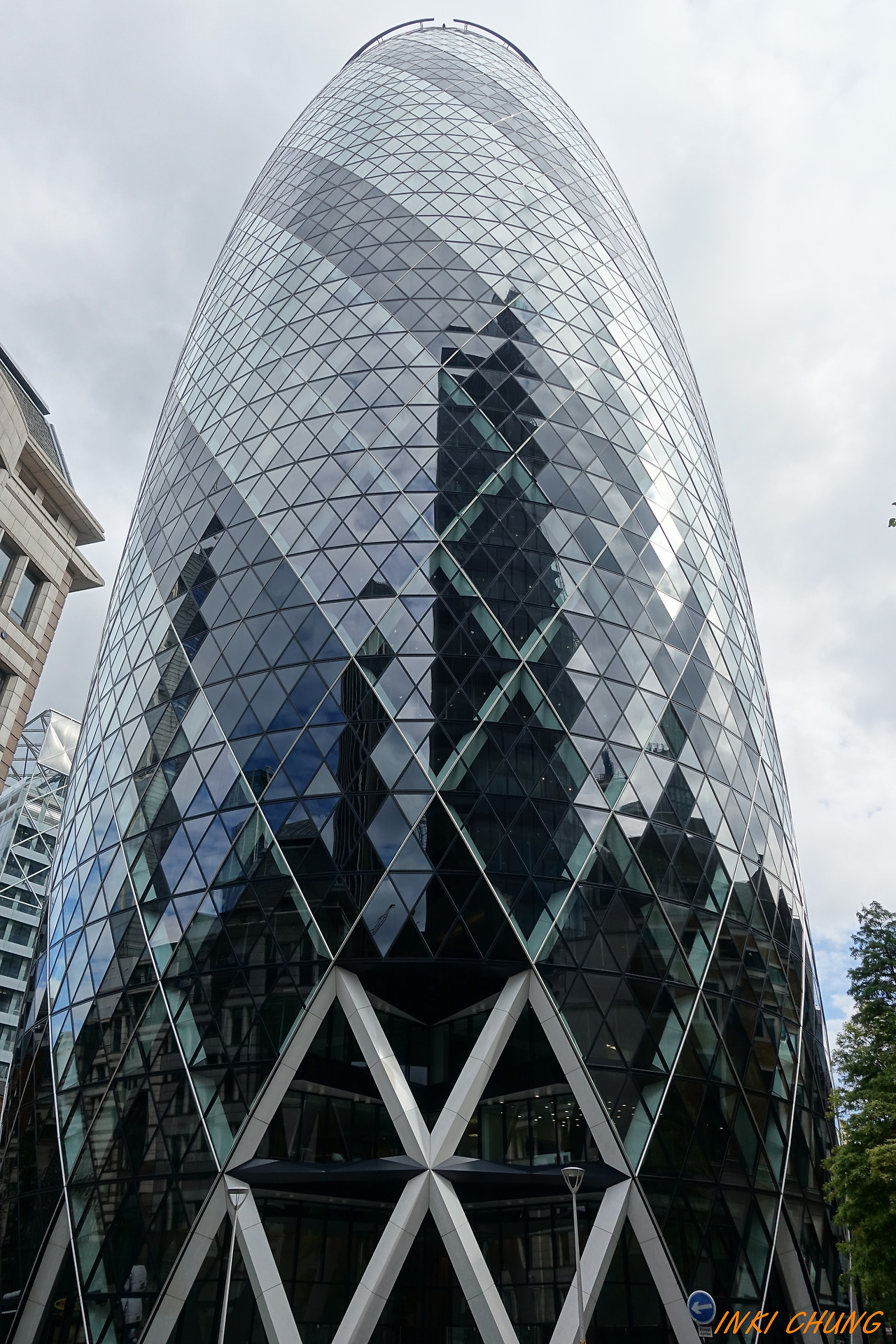 생김새가 오이를 닮아서 The Gherkin이라 부름. 베를린 국회의사당 라이히슈타크, 홍콩 첵랍콕 공항을 설계한 노만 포스터(Norman Foster) 남작의 작품