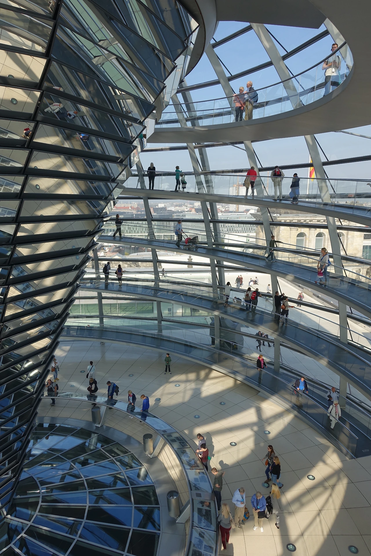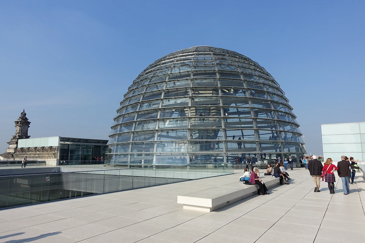 옥상의 유리로 된 돔과 돔 안에서 꼭대기로 올라가는 나선형 길이 특이한 모양의 연방의회 의사당이다. 싸이트에서 미리 신청하고 여권을 지참하여야 입장이 가능하다. 낮에는 돔 안을 투과하는 햇살을 느낄 수 있으며 밤에도 내부의 등으로 베를린 뿐만 아니라 독일 전역을 빛낸다.