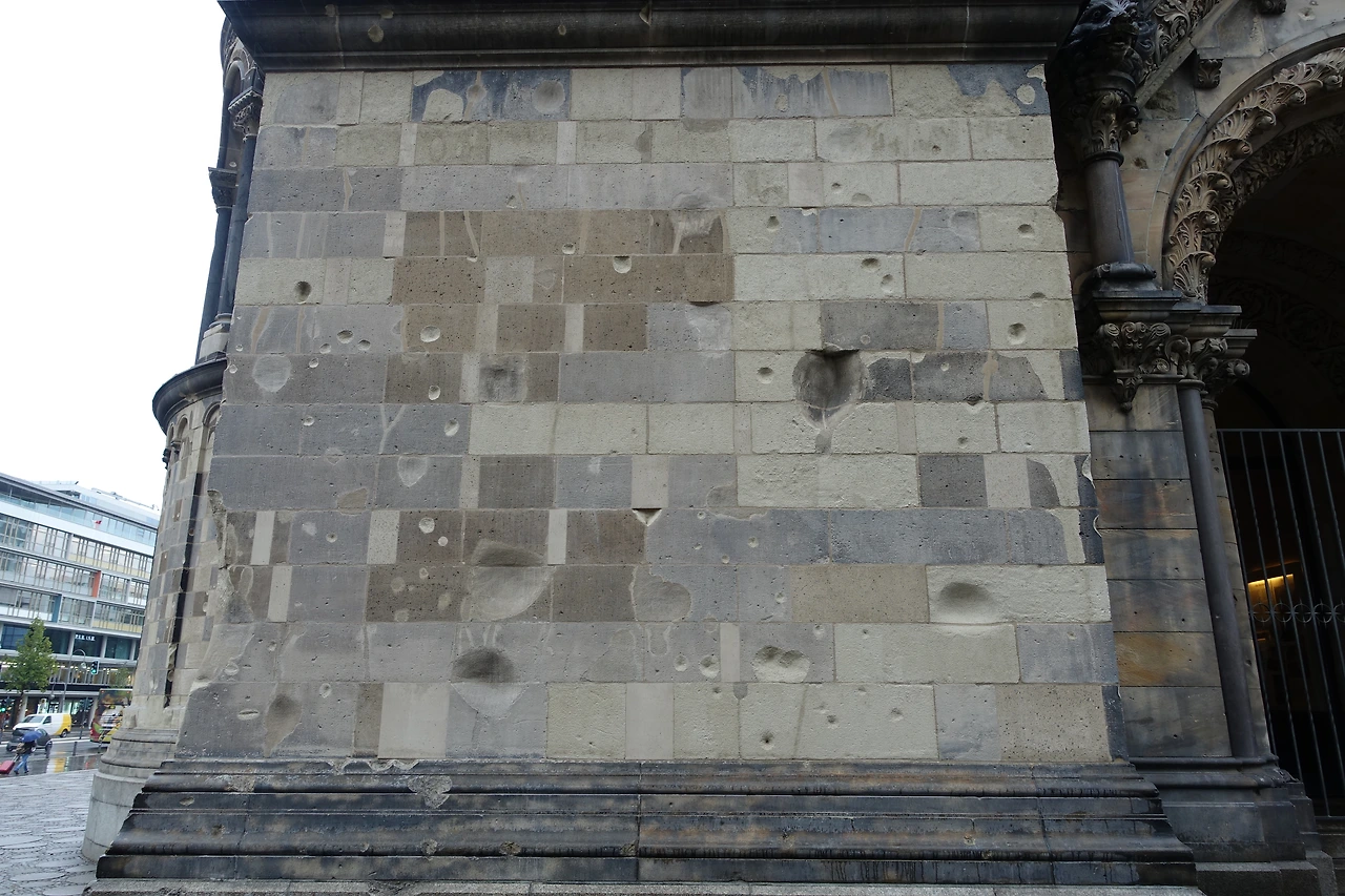 오와 열이 맞추어진 파란색의 스테인드 글라스와 두 팔을 벌리고 있는 예수님이 인상적이고 마음에 새겨지지만 내가 이야기하고 싶은 부분은 다른 곳에도 있다. 사진 속 오른편인 신관의 왼편에 포탄 맞은 본관을 그대로 살려놓았다. 과거의 아픔을 그대로 간직하여 다시는 이러한 일을 반복하지 않으리라 속죄하는 현장이라는 점이 이 곳을 위대하게 만든다. 이것이 카이저 빌헬름교회를 첫번째로 뽑은 이유이다.