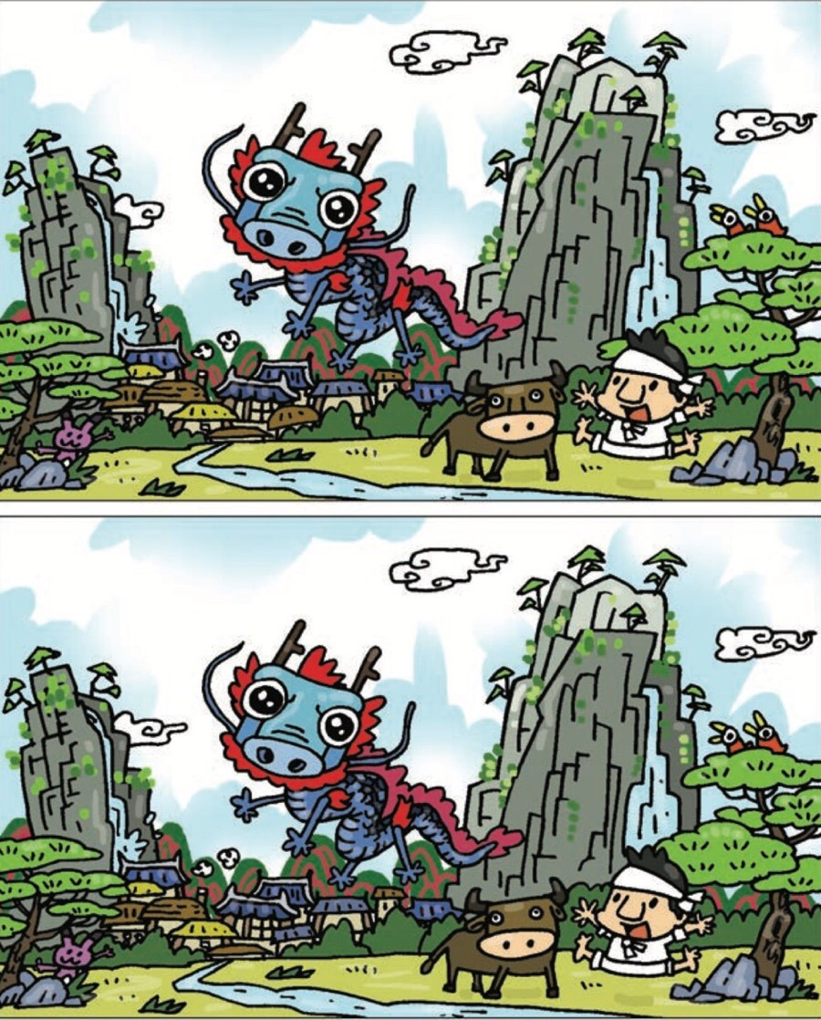 "이거 다른 거 찾는 거지?" 두 아이는 한참을 쳐다보고 몇 개를 맞췄다. 더 이상 찾지 못하고 조금 지루해지려는 찰라둘째 아이가 드디어 찾았다는 눈빛으로 자신 있게 말했다. "아래 용은 눈이 슬픈데,위에 용은 눈이 기쁘네!"