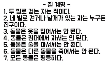 주인을 내쫓은 동물들은 처음으로 다음과 같은 7계명을 정했고 변함없는 율법이라 칭했다.