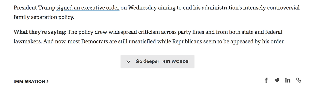 기사를 제외하고 악시오스의 가장 특이한 점은 웹사이트 구성입니다. 위에서 언급한데로 페북처럼 타임라인으로 구성돼 있고, 모든 기사에는 요약본이 제공됩니다. 독자는 scroll down하면서 한눈에 기사의 핵심내용을 보면서 넘어갈 수 있습니다. 더 깊은 내용을 원하면 go deeper를 누르면 됩니다. 굉장히 효율적입니다만. "이게 그렇게 대단한가..." 싶은 생각도 듭니다.