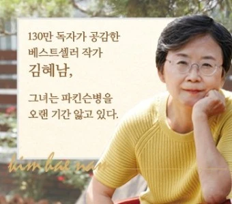 '서른 살이 심리학에게 묻다'의 저자로 유명한 정신분석학자 김혜남은 42세 때 발명한 파킨슨병으로 투병 중이다. 그녀는 출판계에 '힐링' 열풍을 불러일으키며 60만 부 팔린 '서른 살이...'를 낸 후로 14년째 후속작도 베스트셀러에 오른 작가로 활동하고 있으며, 여전히 병의 한가운데에 있다.