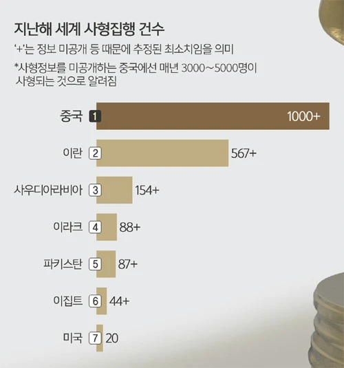 국가별 사형 집행건수는 중국이 1,000명으로 압도적으로 많았지만, 인권을 중시하는 자유민주주의 국가 중에는 미국(18명)과 일본(1명)도 포함돼 있습니다.