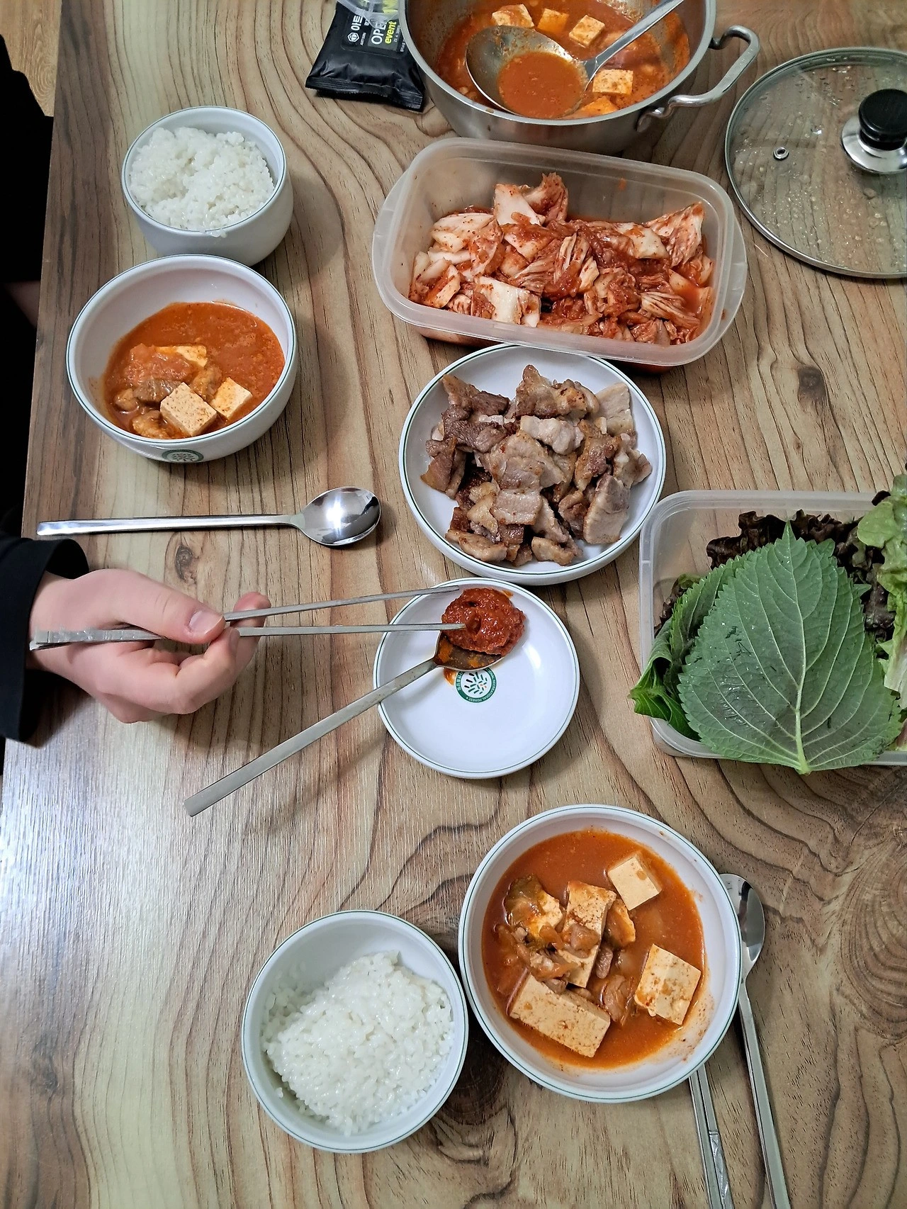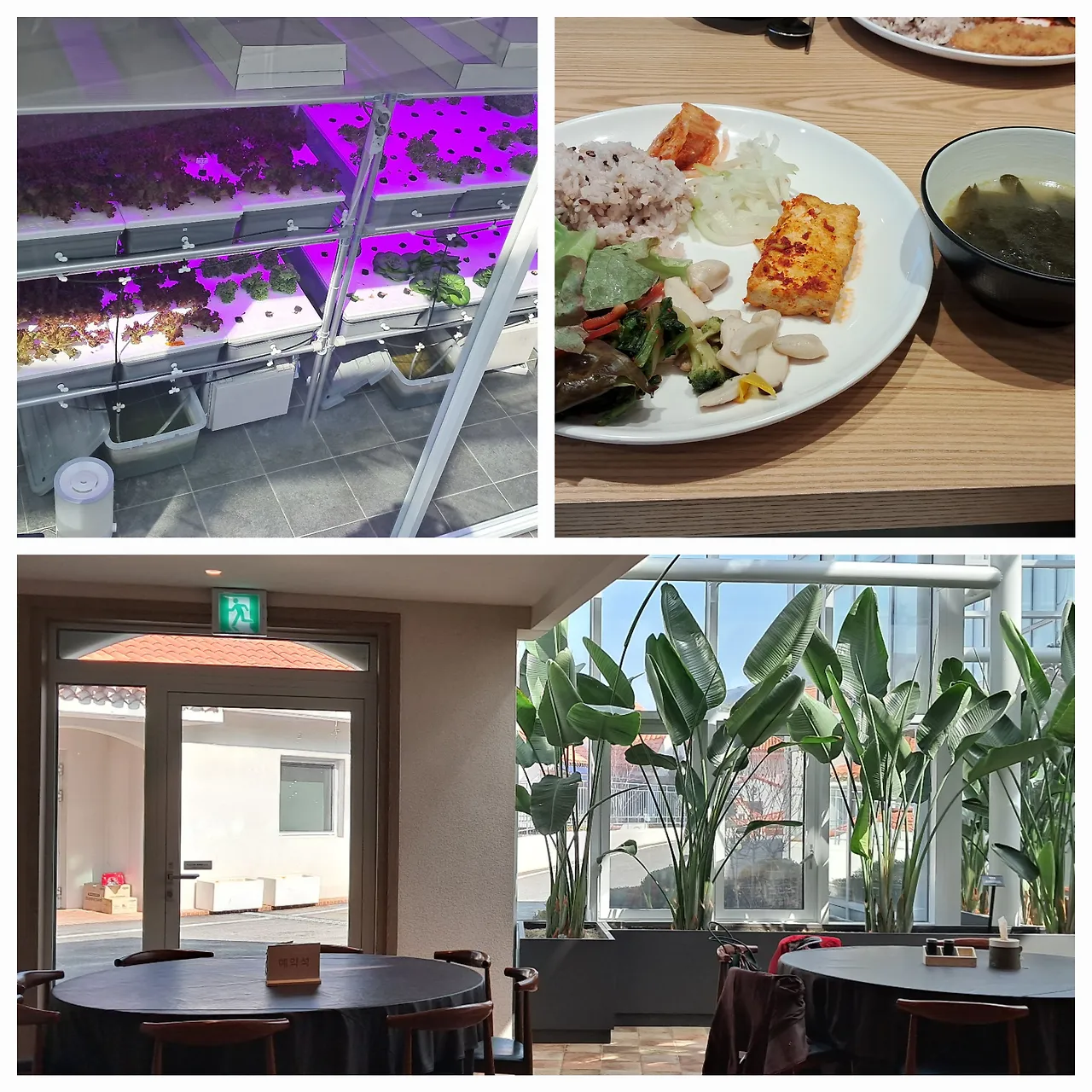 스마트 재배를 통해 직접 가꾼 채소들로 차린 밥상이라 정갈해서 안심됩니다. 통창으로 이른 봄의 햇살이 인사를 건네오네요.