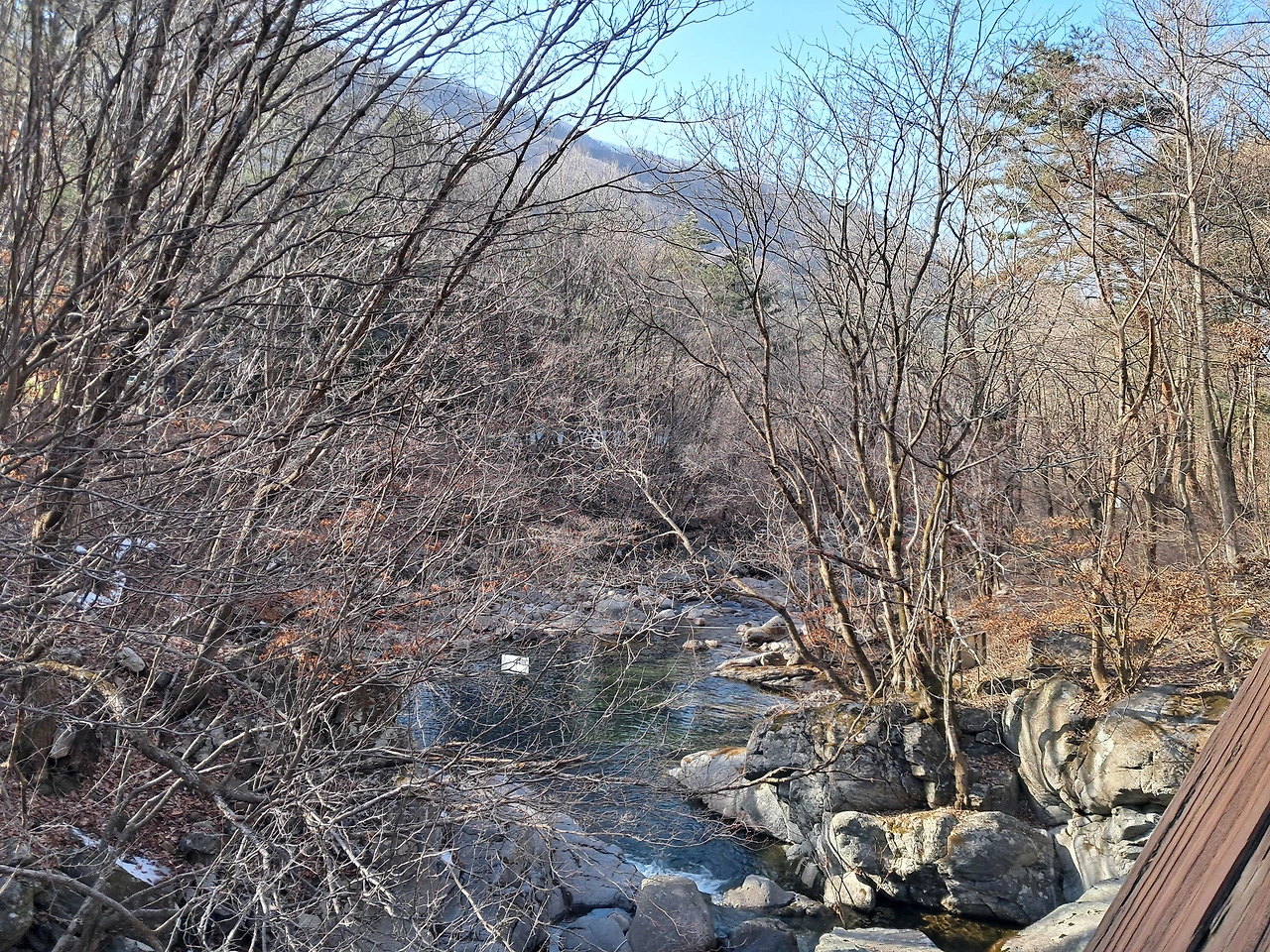 우리의 산책을 반기듯 아직 차가운 공기에도 불구하고 산속 개천은 무심하게 흐릅니다.