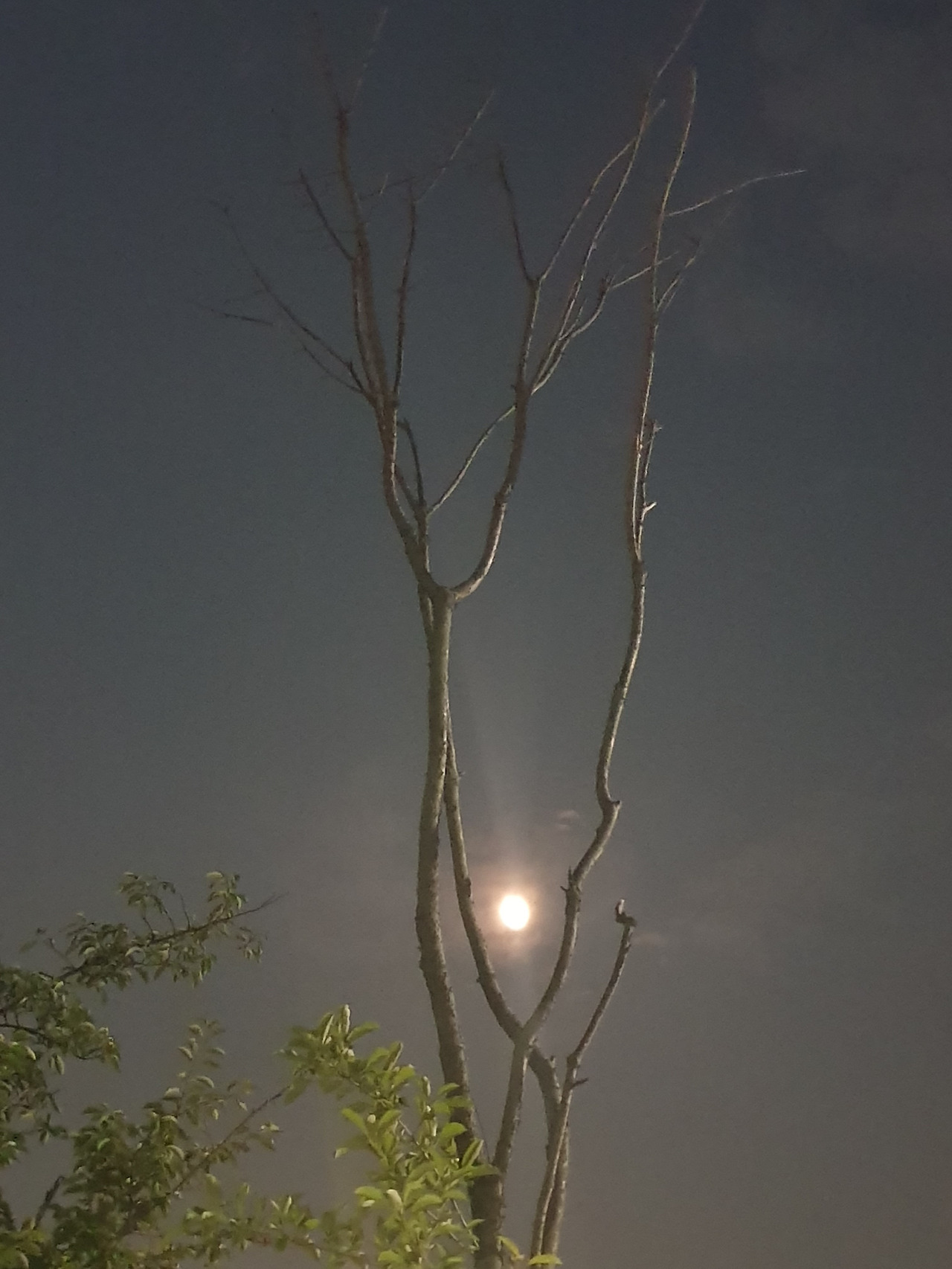 나무가지 뒤에 숨어서 떠오르는 광경을