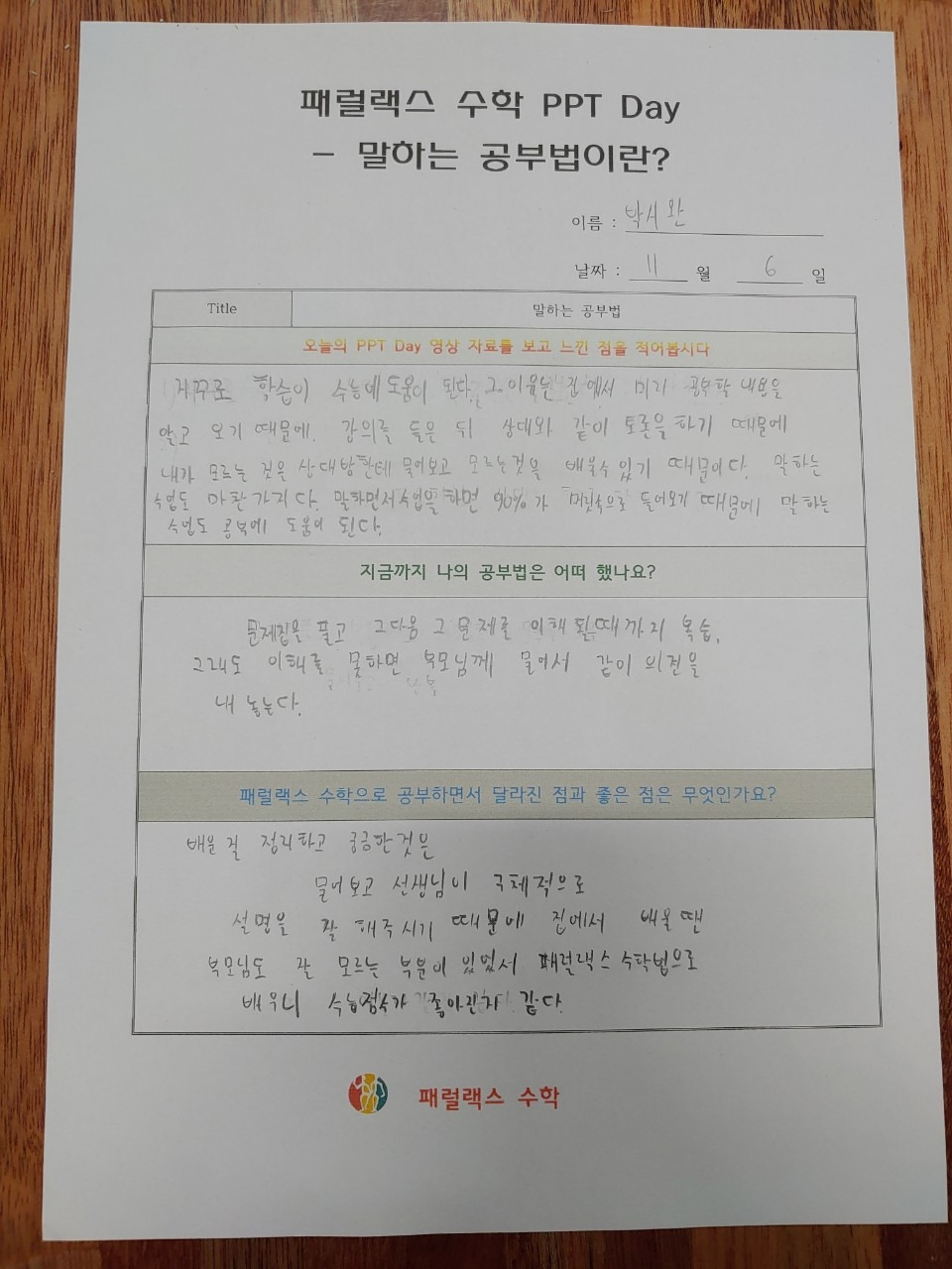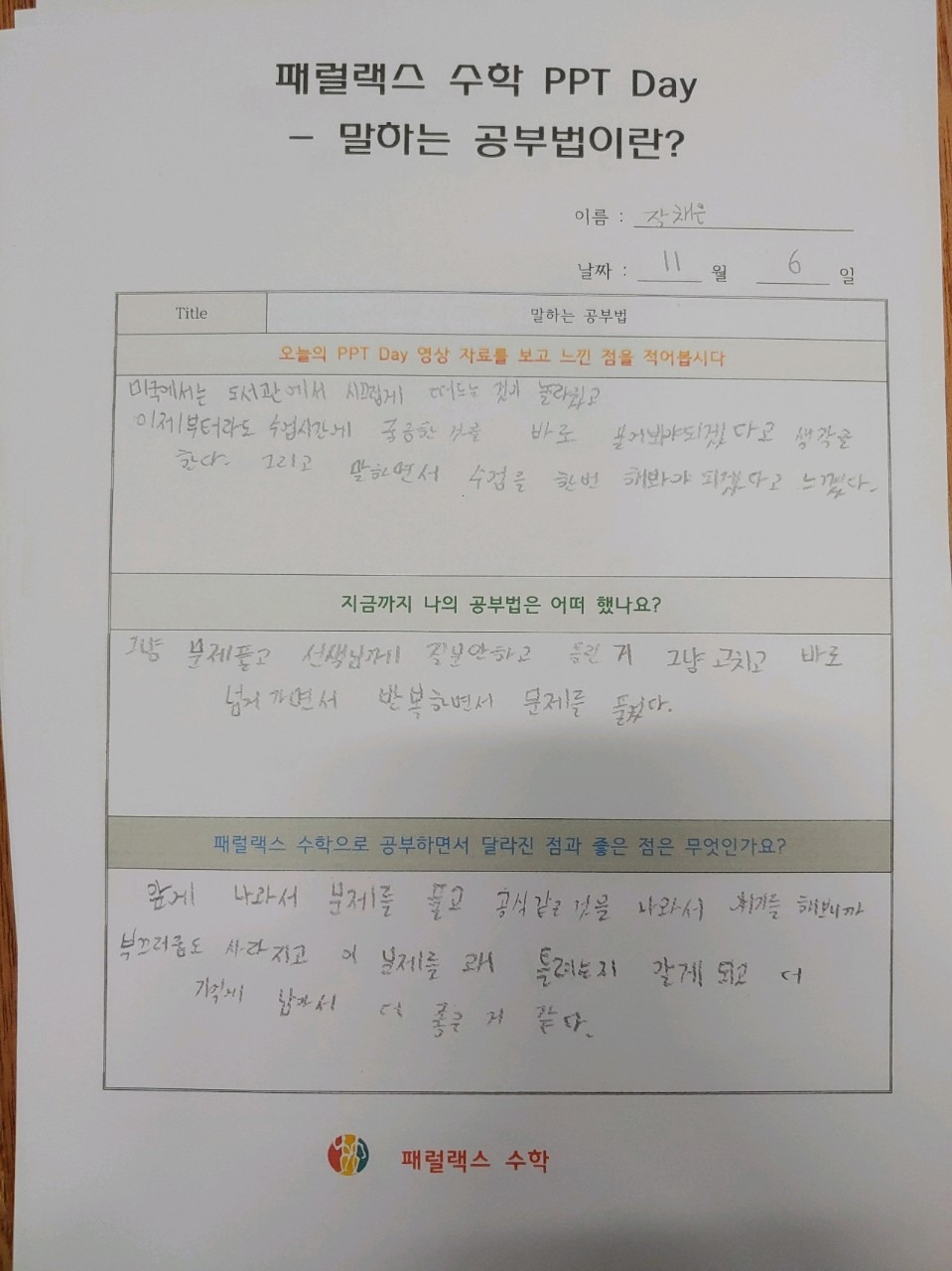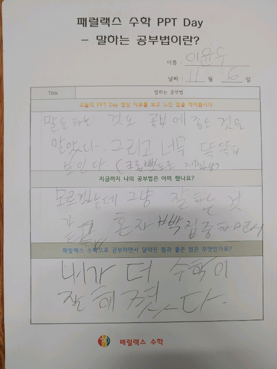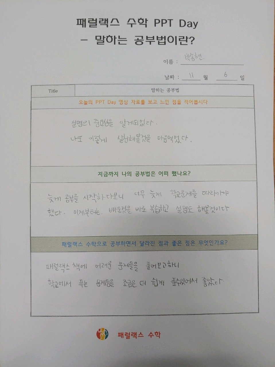Parallax수학 수업시간 중 스스로 공부한 개념을 발표하는 학생