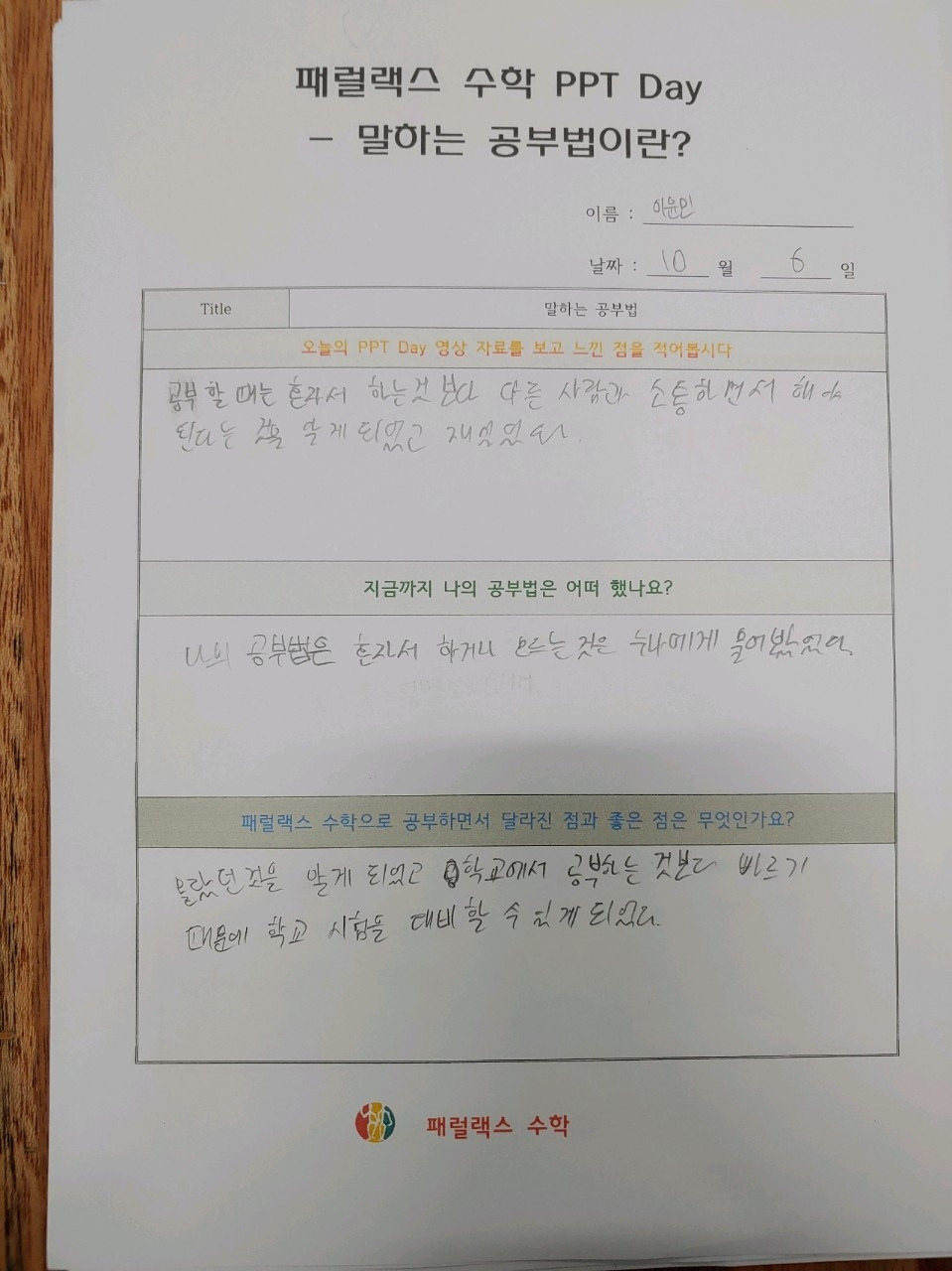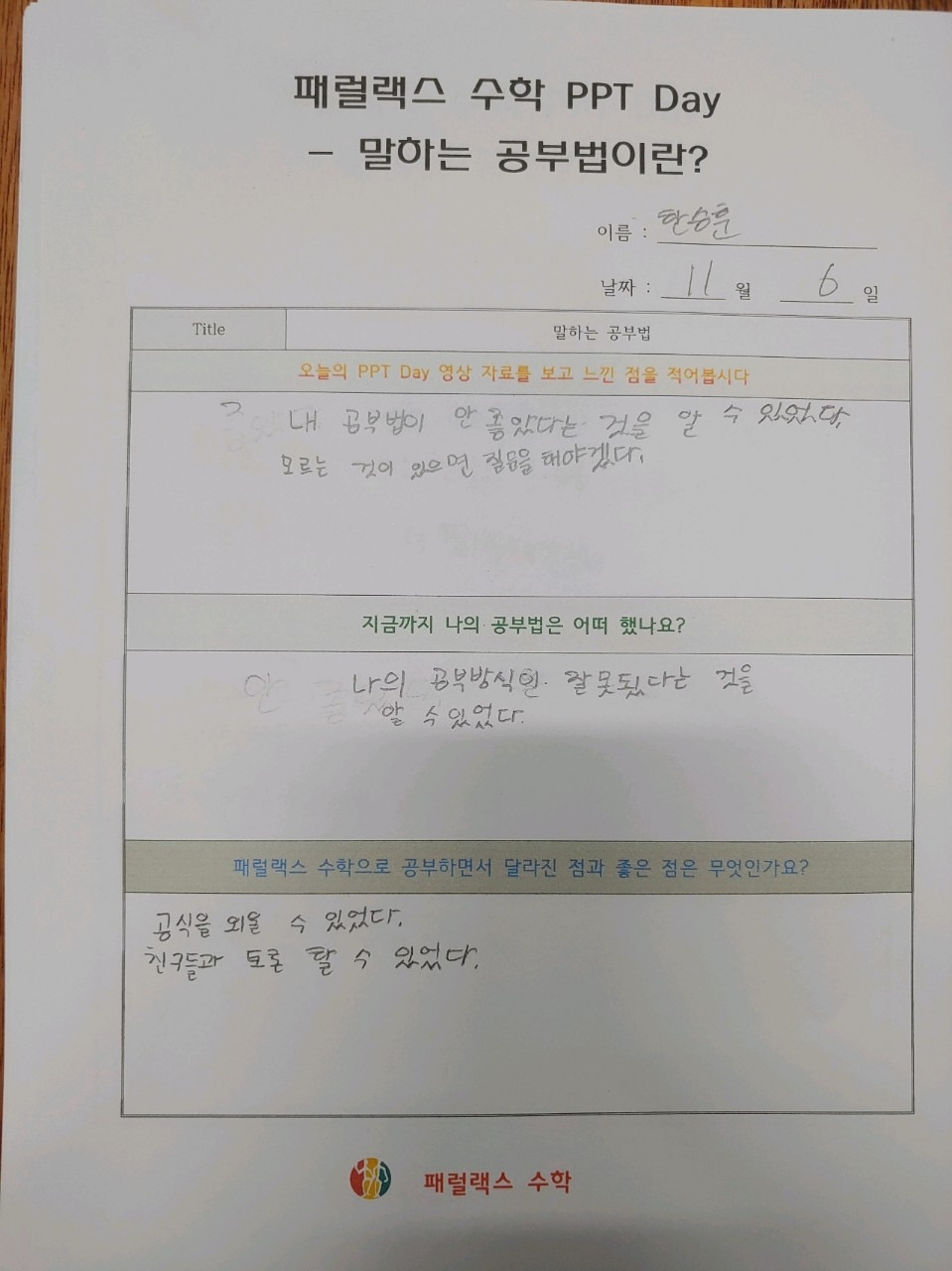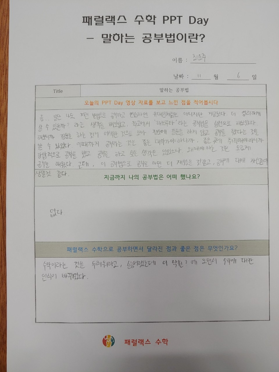 Parallax수학 수업시간 중 스스로 공부한 개념을 발표하는 학생